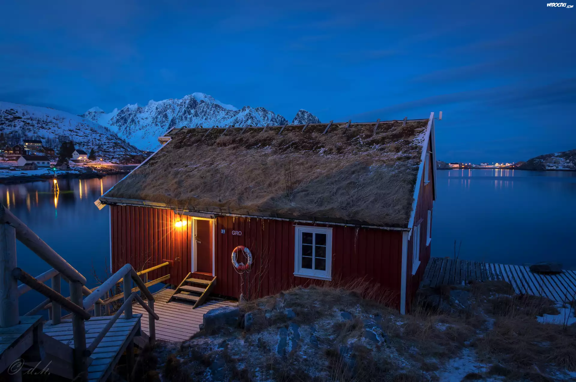 ZdjÄ™cia, Norwegia, Wioska Reine, Wyspa Moskenesøya, Domek, Jezioro, Góry, Noc, Zima