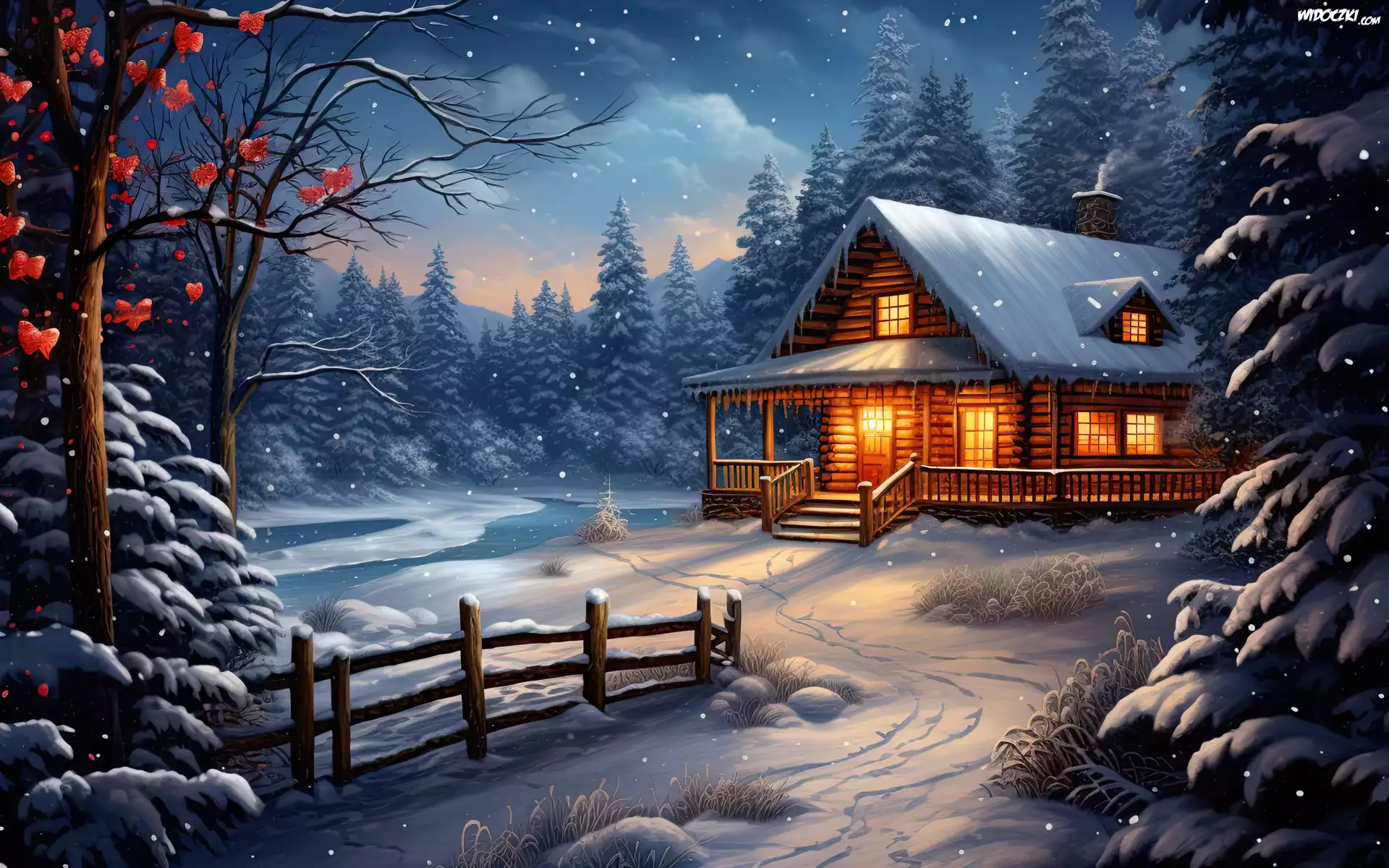 Zima, Las, Drzewa, Dom, Ogrodzenie, Śnieg, Światła, 2D