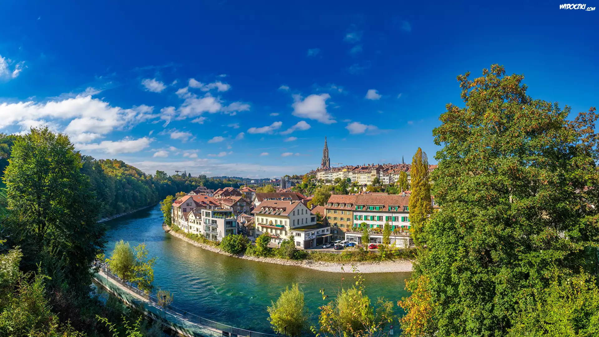 Szwajcaria, Berno, Rzeka Aare, Domy, Drzewa