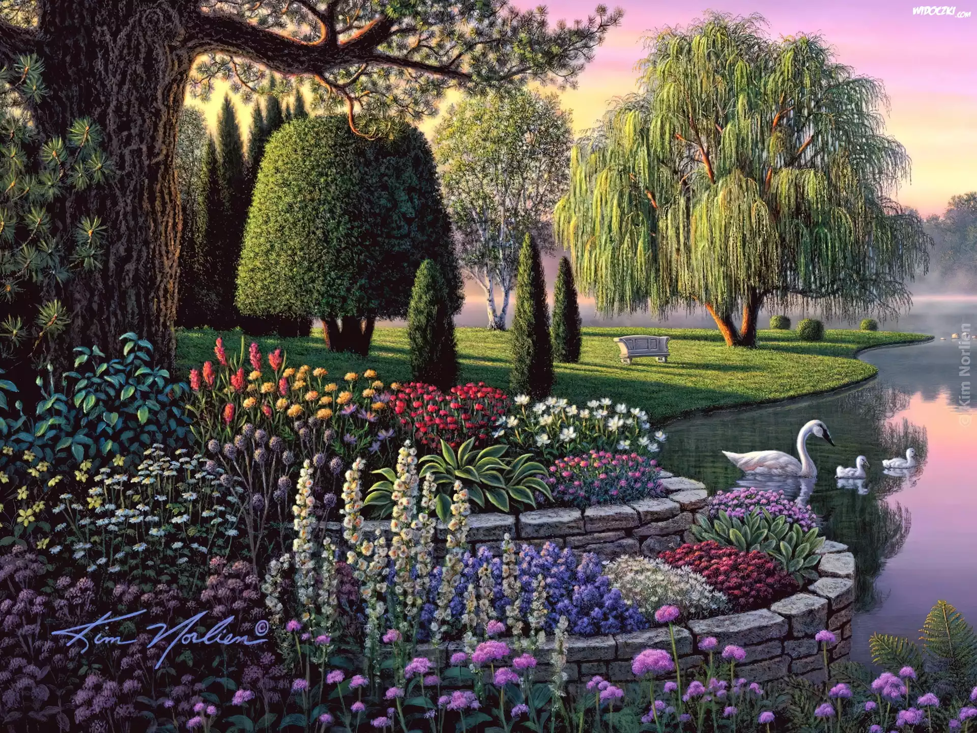 Zdjęcia, Ogród, Łabędzie, Kwiaty