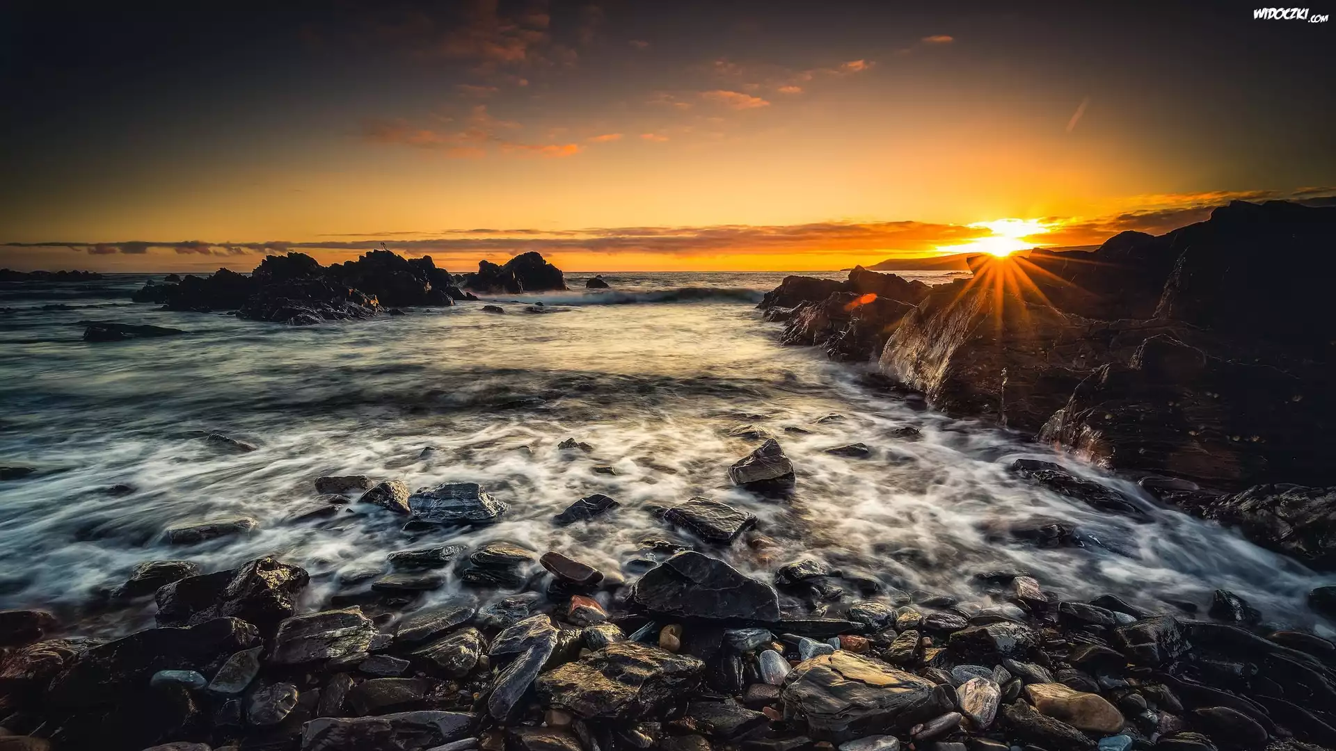 Szkocja, Aberdeenshire, Wschód słońca, Morze, Kamienie, Skały