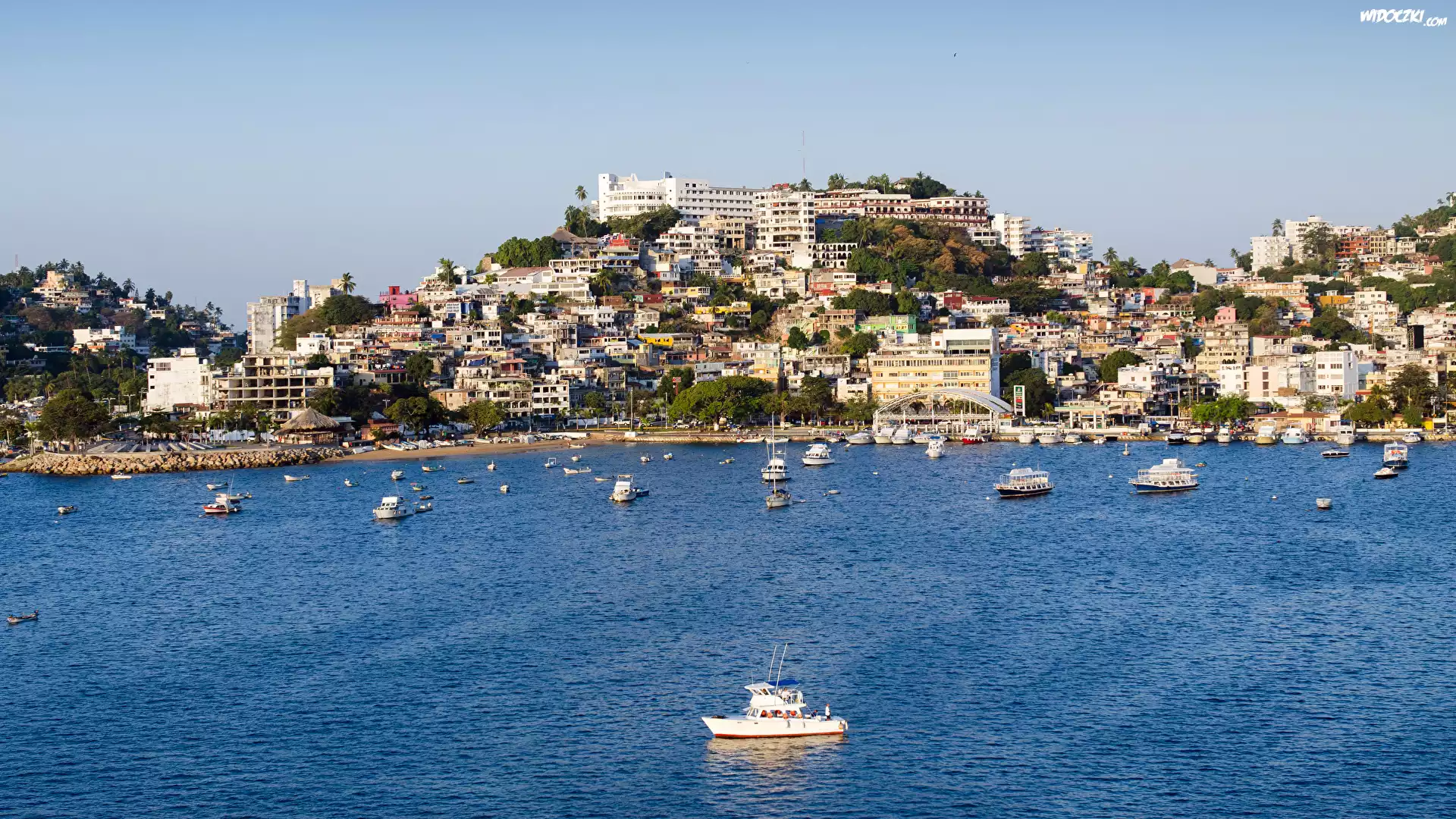 Meksyk, Acapulco, Kurort, Wzgórze, Domy, Morze, Motorówki, Zatoka