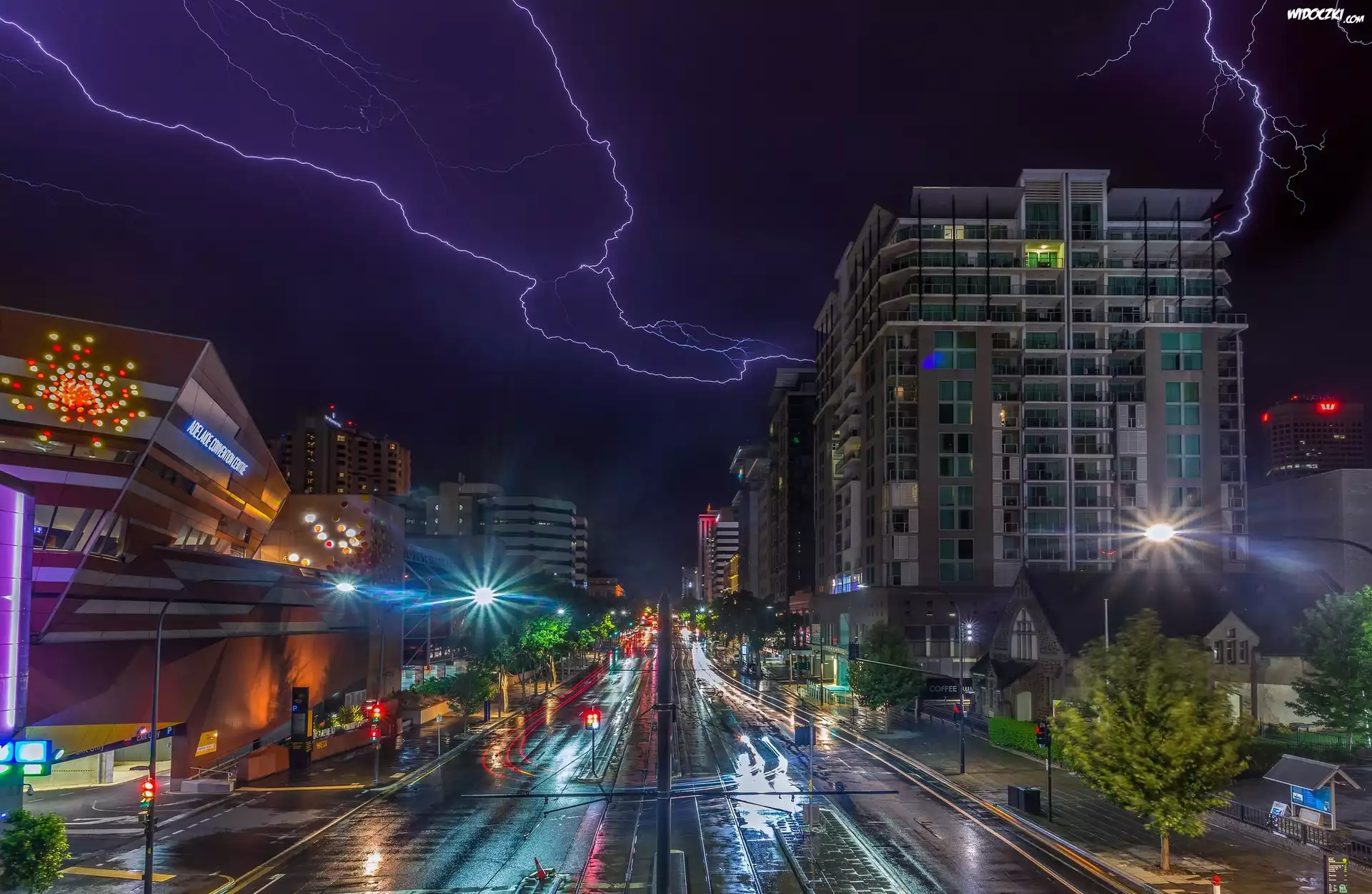 Miasto Adelajda, Australia, Światła, Noc, Pioruny, Burza