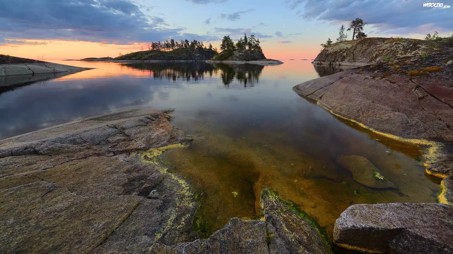 Zdjęcia, Jezioro, Ładoga, Rosja, Karelia, Wysepka, Skały, Drzewa, Chmury