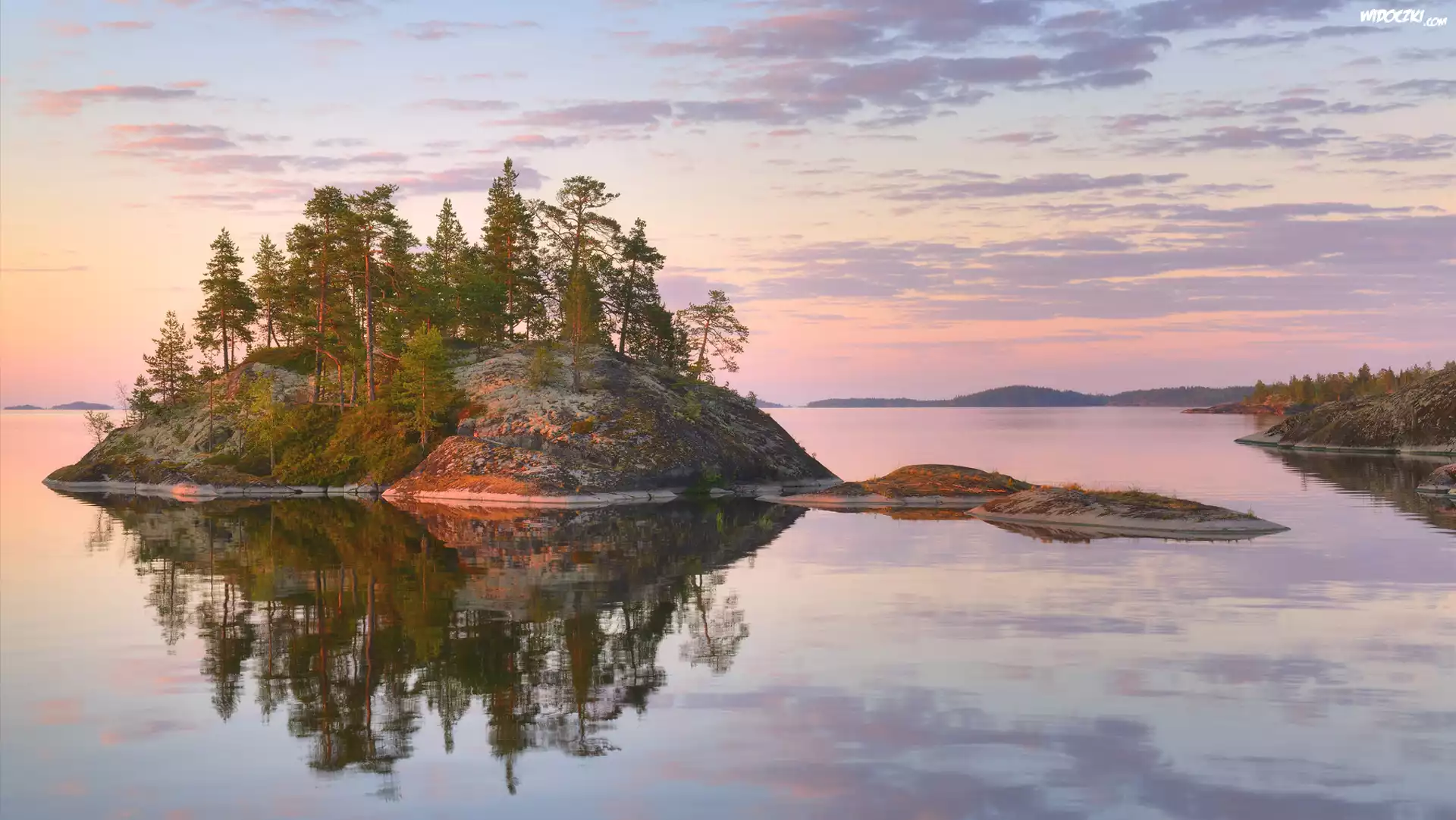 Zdjęcia, Jezioro Ładoga, Skała, Wysepka, Drzewa, Karelia, Rosja