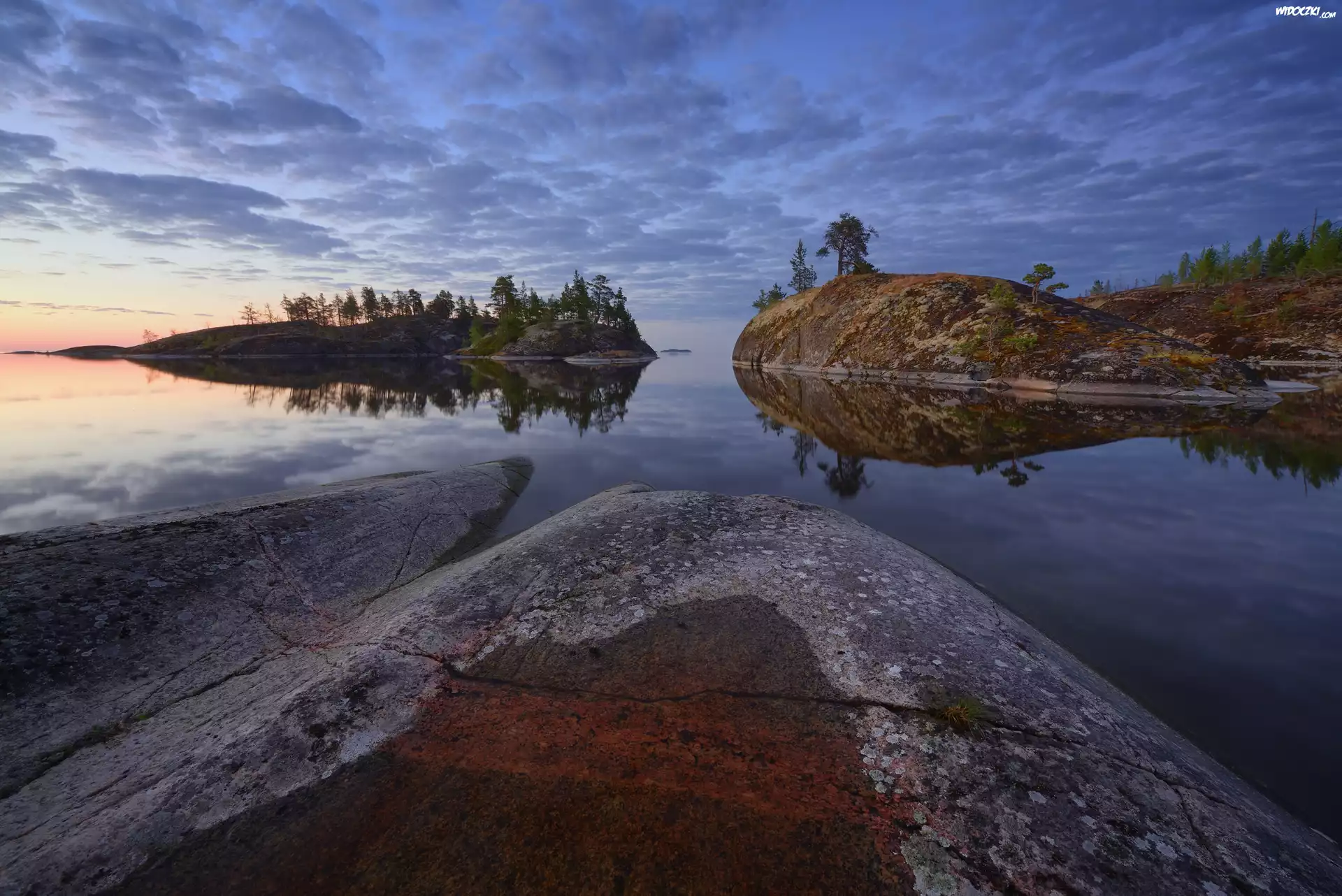Zdjęcia, Jezioro Ładoga, Wysepki, Drzewa, Karelia, Rosja, Świt