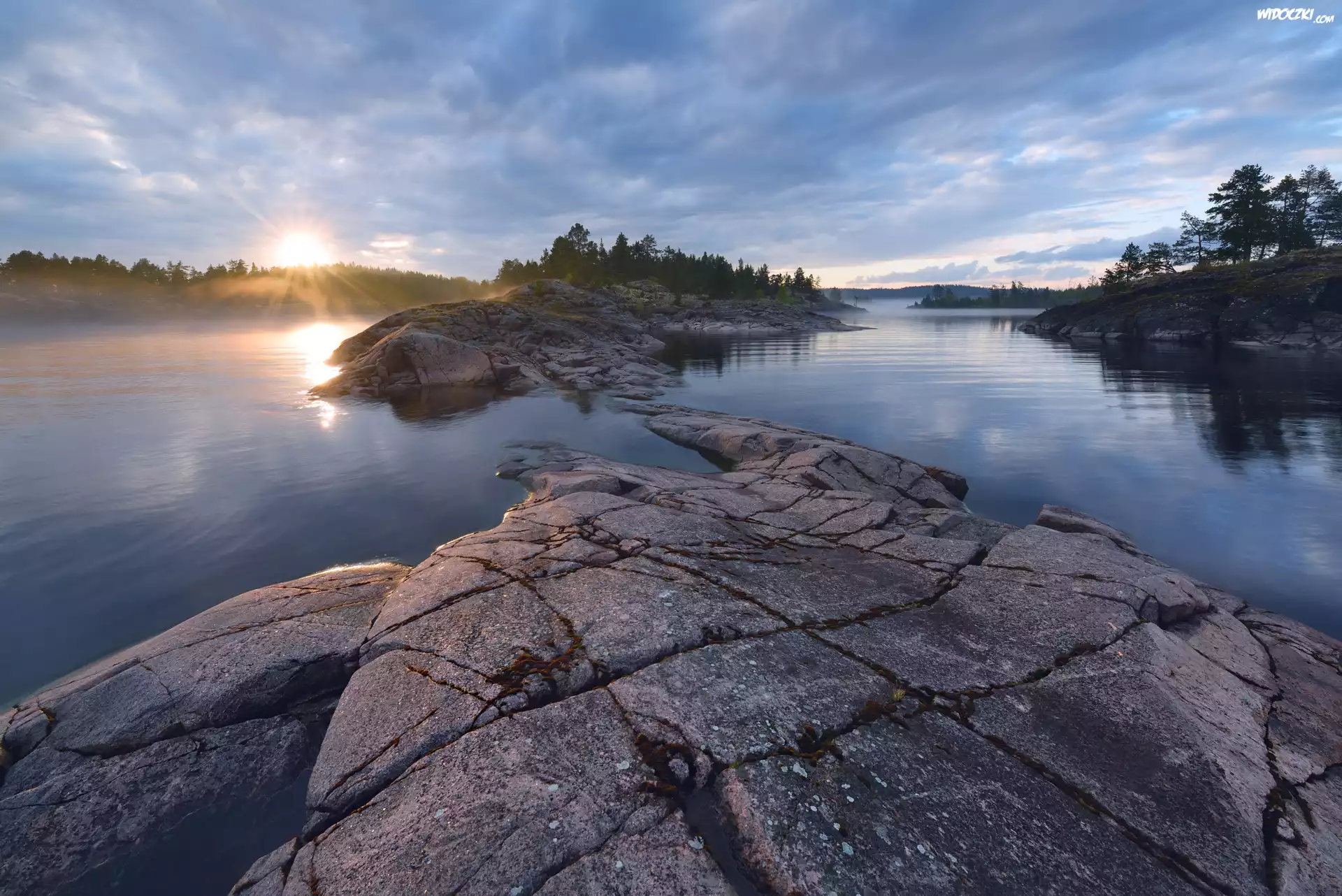 Jezioro Ładoga, Wysepki, Drzewa, Wschód słońca, Karelia, Rosja