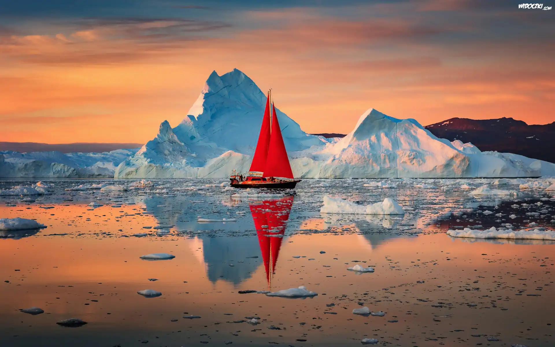 Góry lodowe, Morze, Odbicie, Wschód słońca, Żaglówka, Czerwone, Żagle