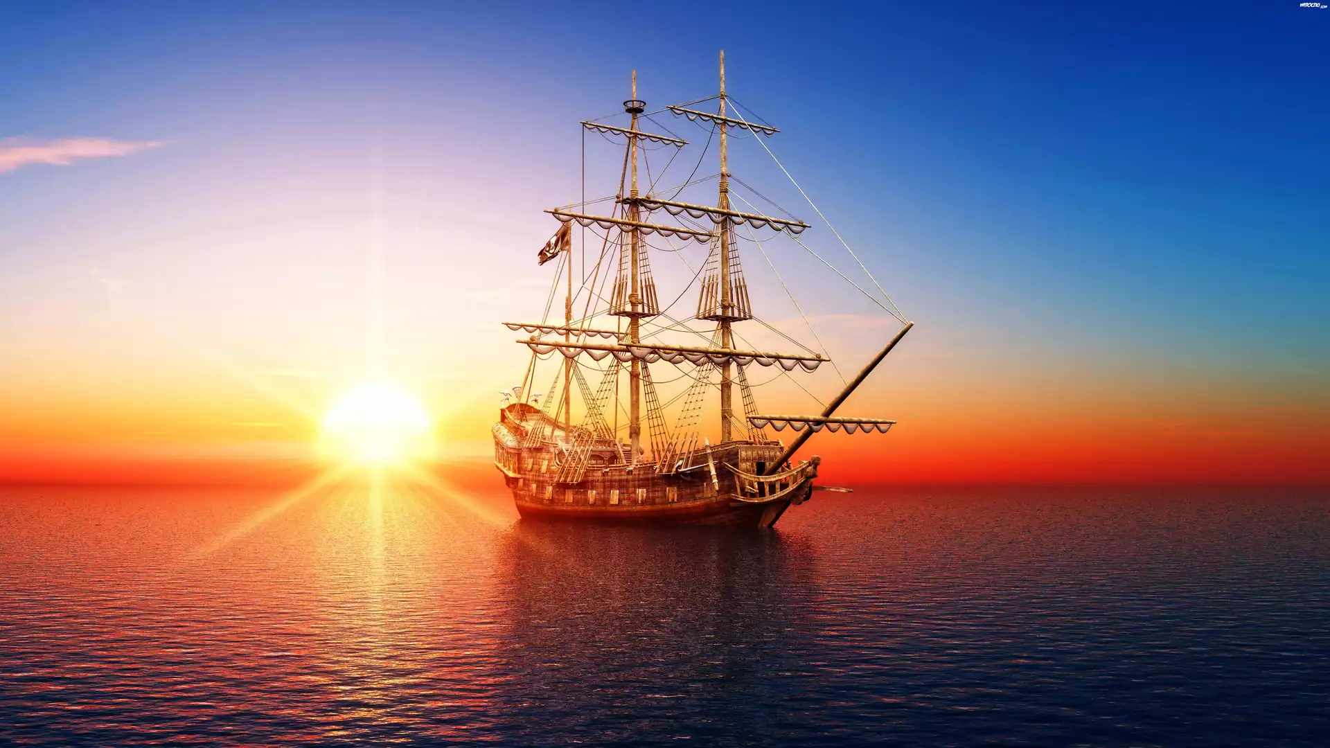 Zdjęcia, Żaglowiec, Flaga, Piracka, Morze, Wschód, Słońca