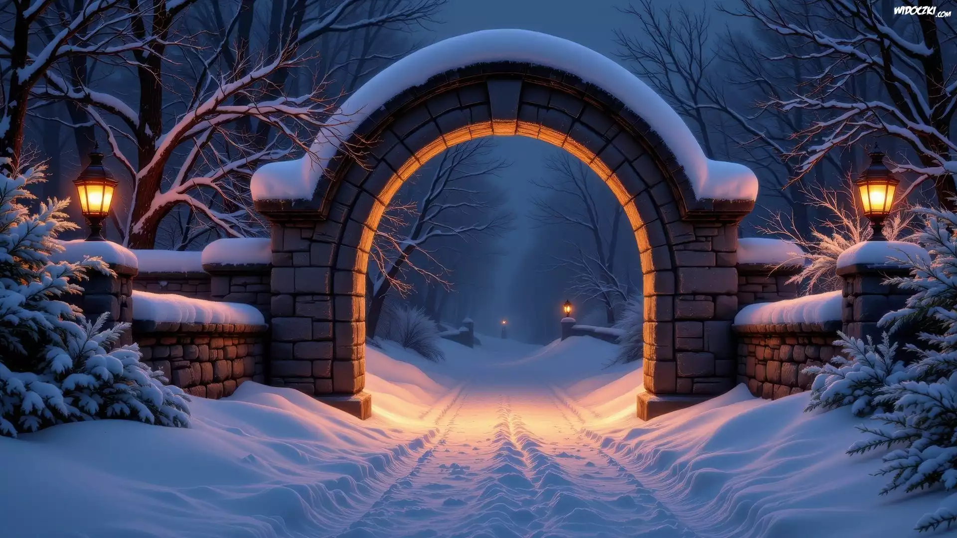 Noc, Zima, Brama, Łuk, Latarnie, Droga, Drzewa, AI
