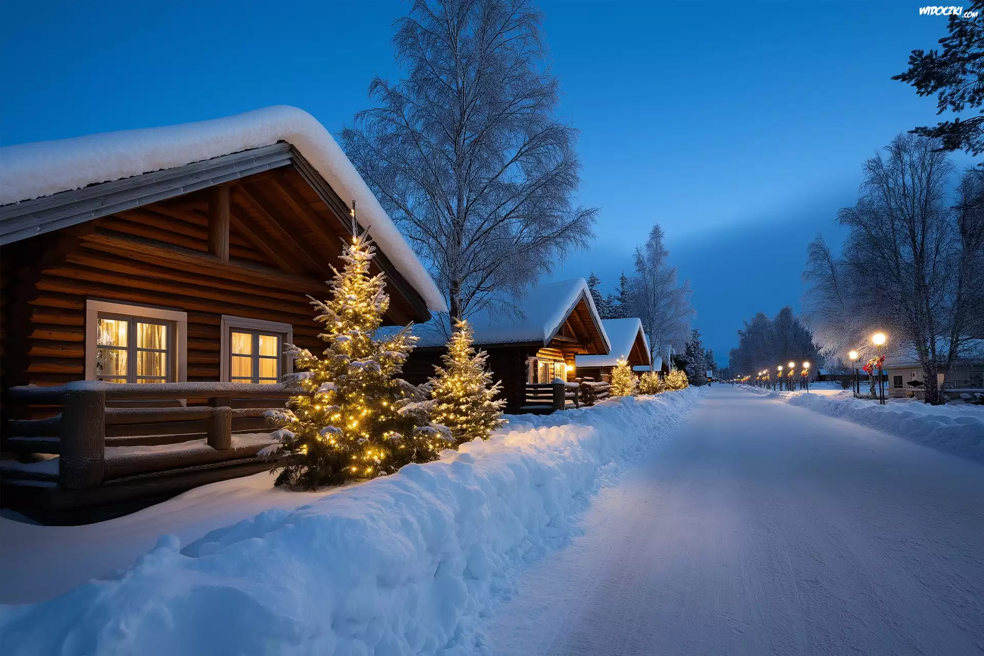 Zdjęcia, Zima, Droga, Domy, Choinki, Boże Narodzenie, Grafika AI