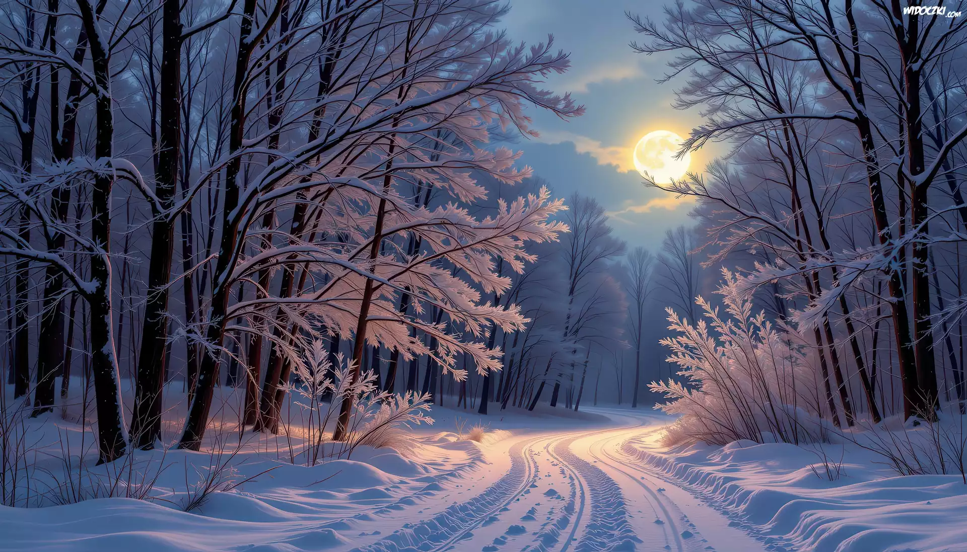 Zdjęcia, Zima, Ośnieżona, Droga, Drzewa, Las, Księżyc, Grafika AI