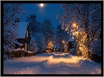Zima, Droga, Drzewa, Światła, Domy, Księżyc, Grafika AI