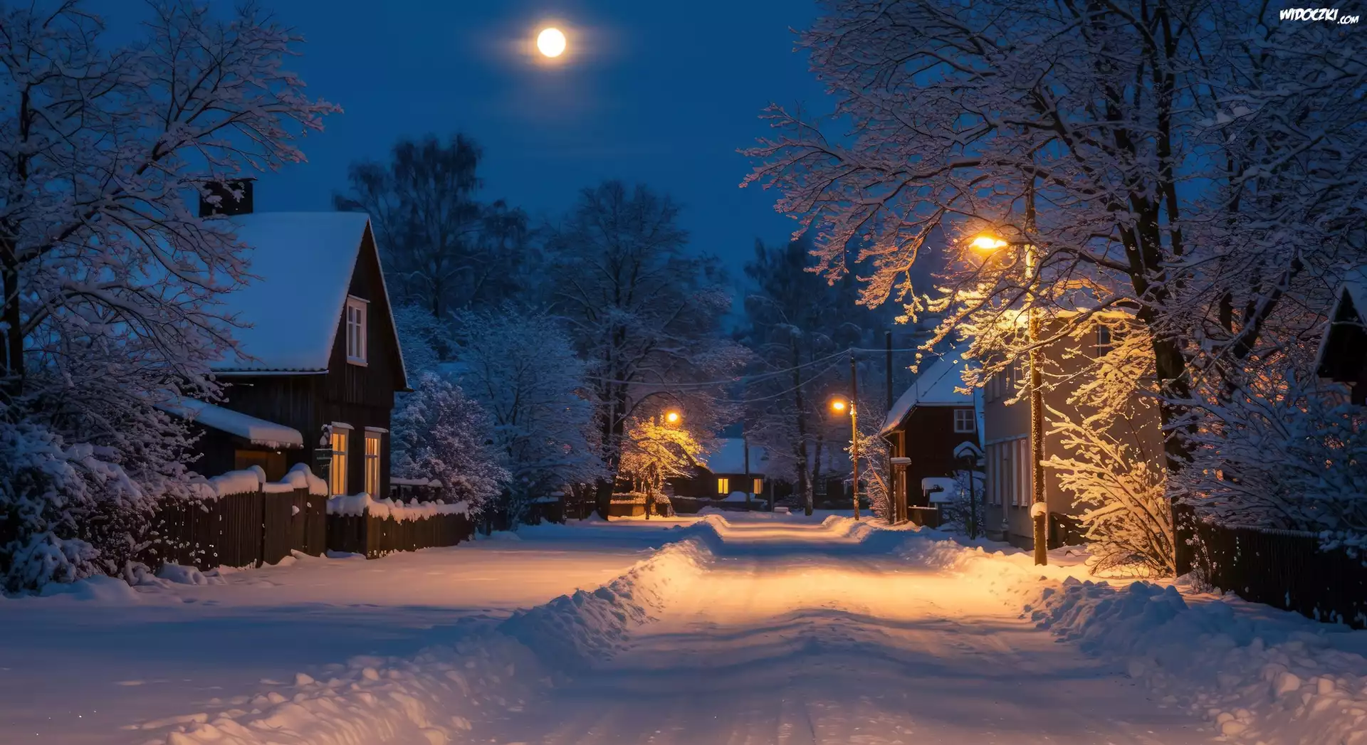 Zdjęcia, Zima, Droga, Drzewa, Światła, Domy, Księżyc, Grafika AI