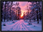 Zdjęcia, Zima, Droga, Drzewa, Las, Zachód słońca, Grafika AI