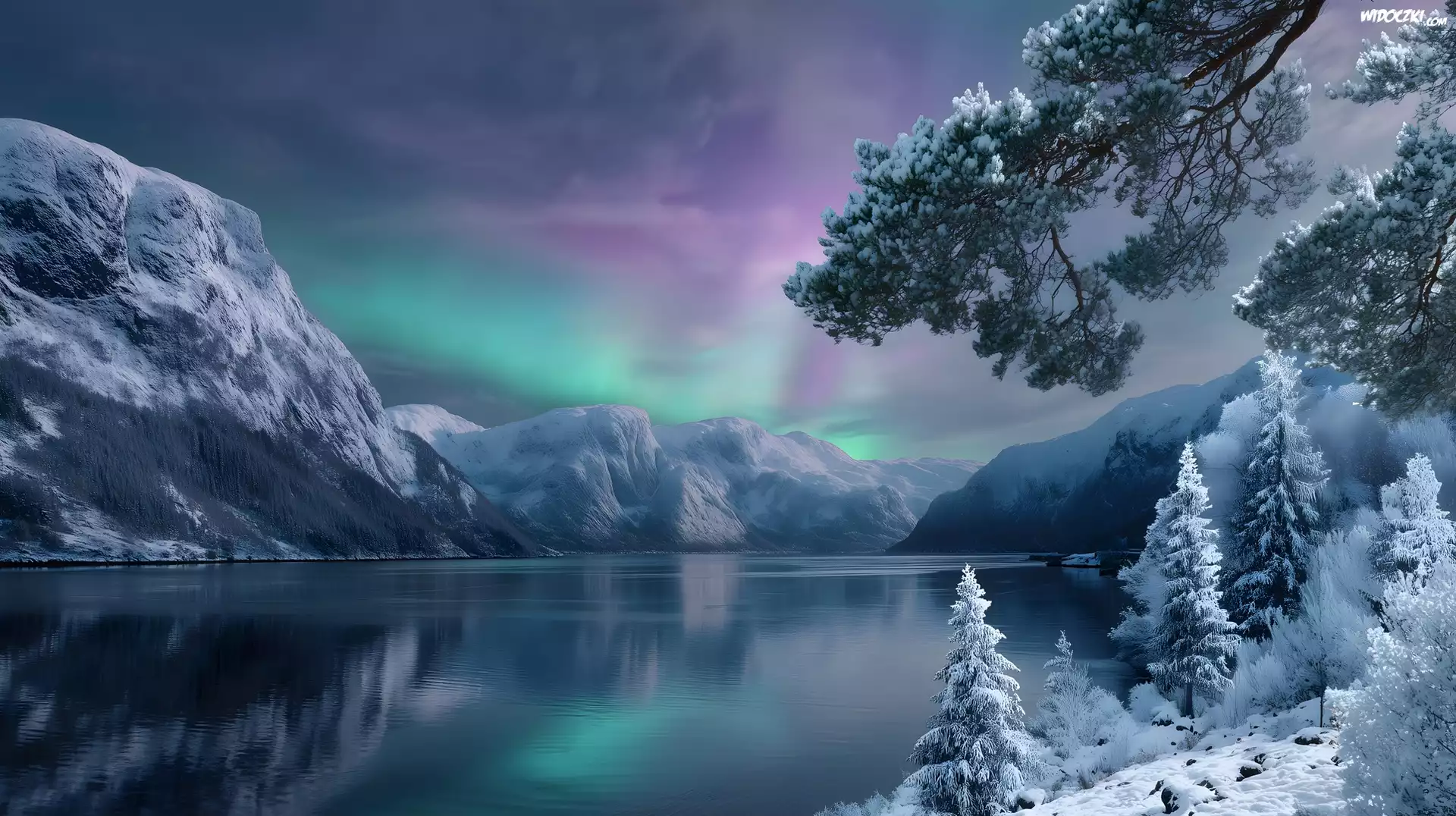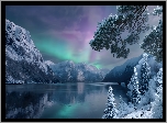 Zdjęcia, Zima, Jezioro, Drzewa, Góry, Zorza polarna, Grafika AI