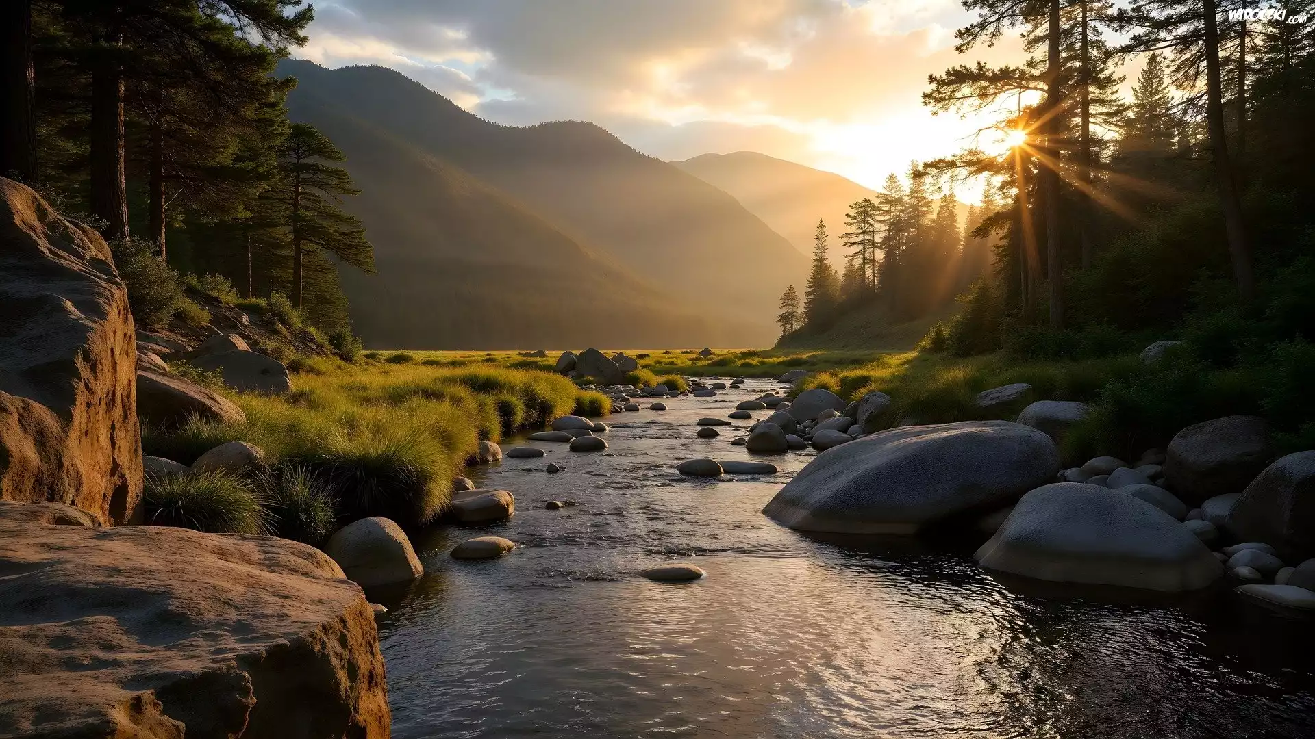 Rzeka, Kamienie, Drzewa, Góry, Promienie słońca, Grafika AI