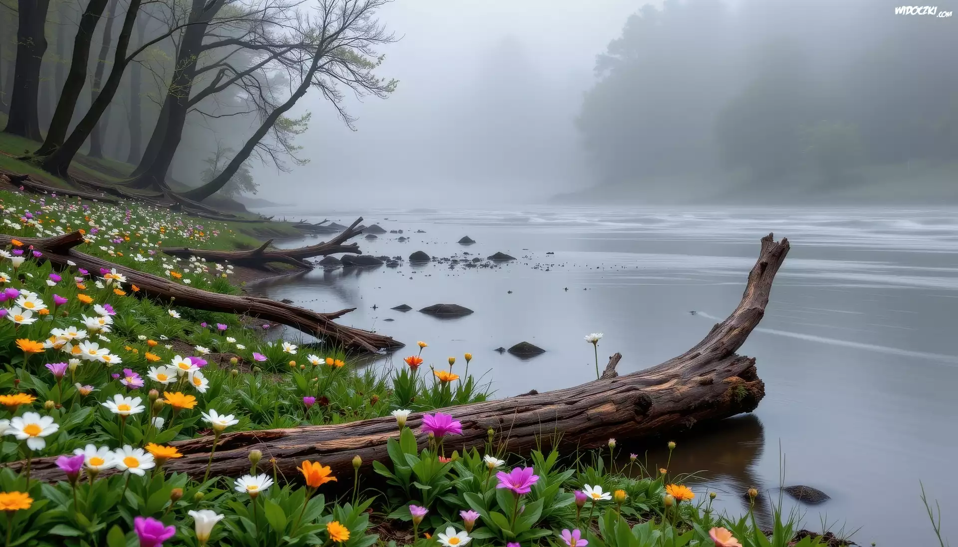 Zdjęcia, Rzeka, Mgła, Drzewa, Kwiaty, Kłody, Drzewa, Grafika AI