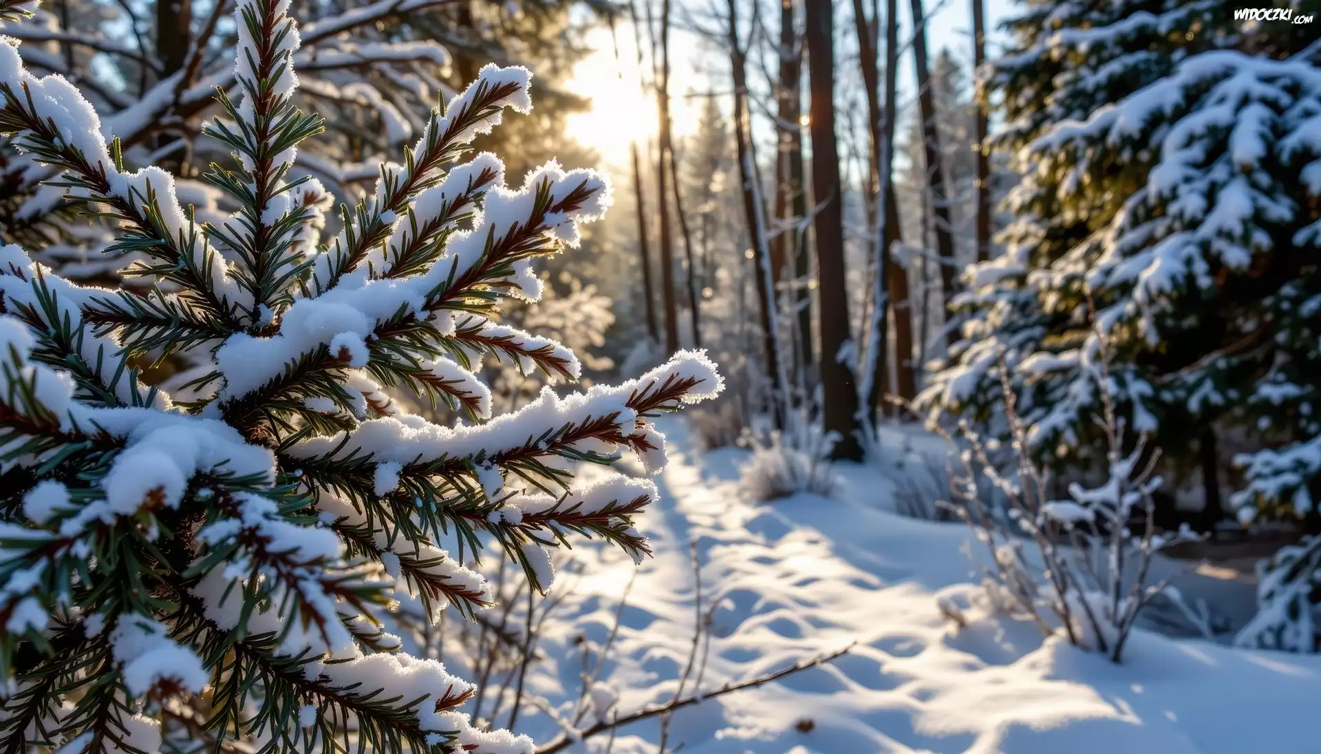 Zdjęcia, Zima, Ośnieżone, Gałązki, Drzewa, Las, Poranek, Grafika AI