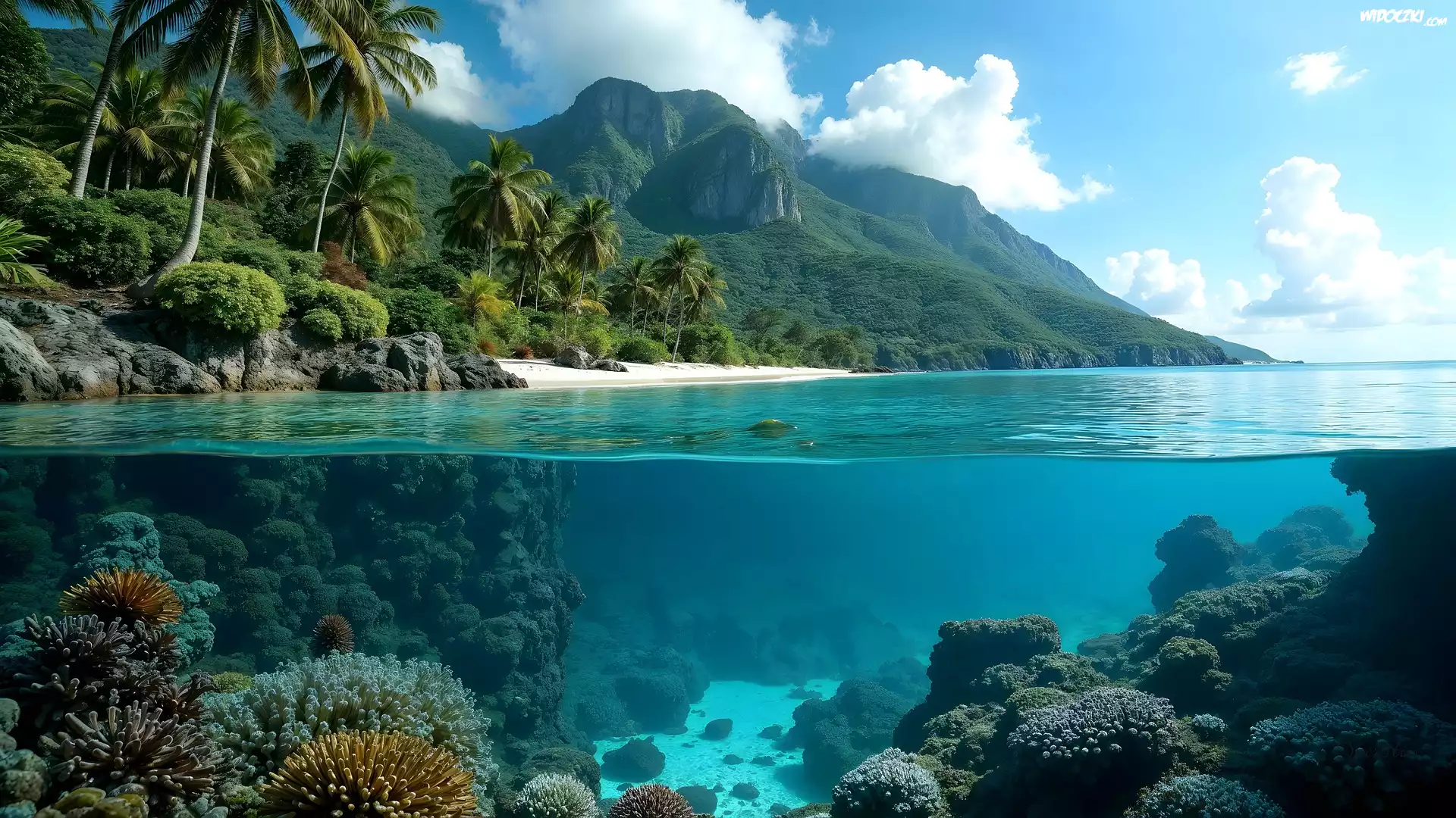 Zdjęcia, Morze, Plaża, Góry, Palmy, Skały, Rafa koralowa, AI