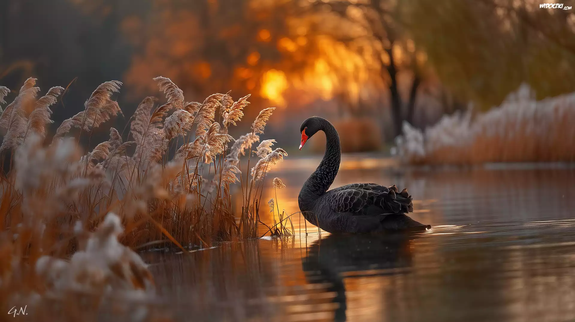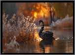 Czarny, Łabędź, Jezioro, Zachód słońca, Szuwary, Grafika AI