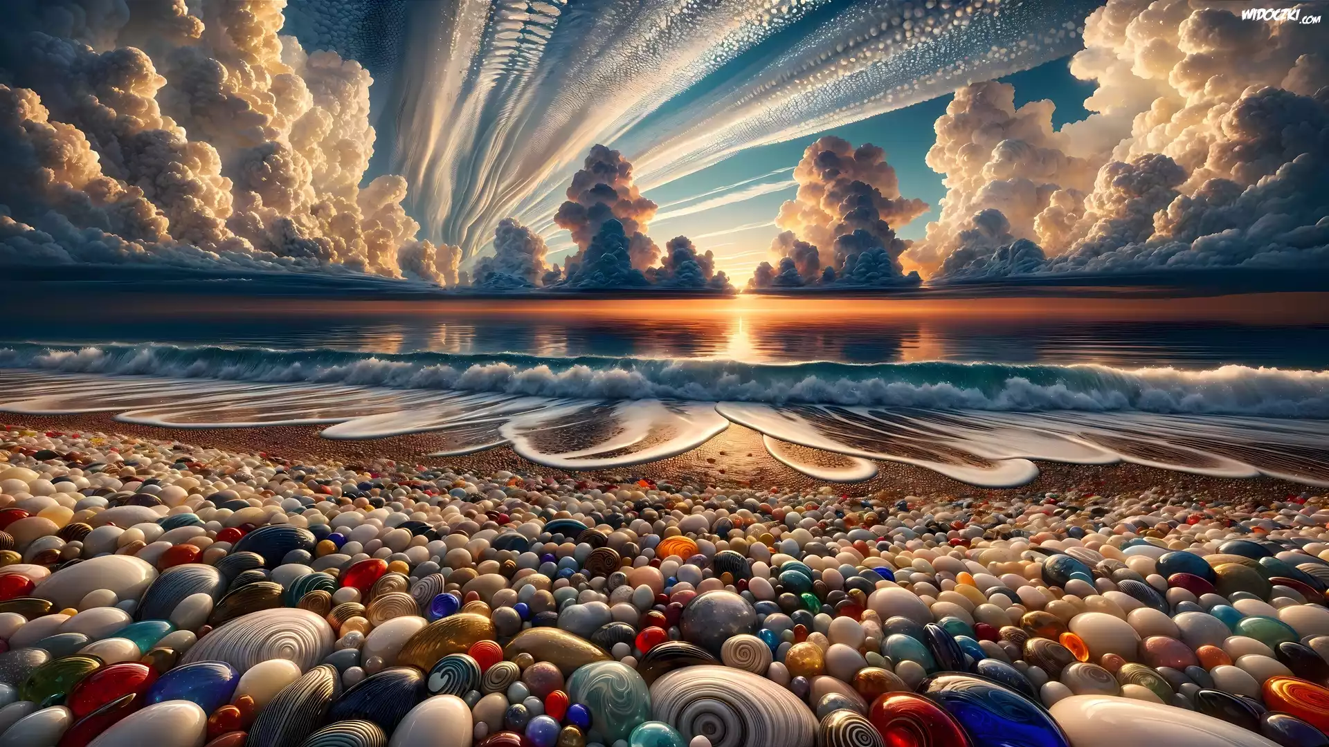 Plaża, Kolorowe, Kamienie, Morze, Niebo, Chmury, Grafika AI