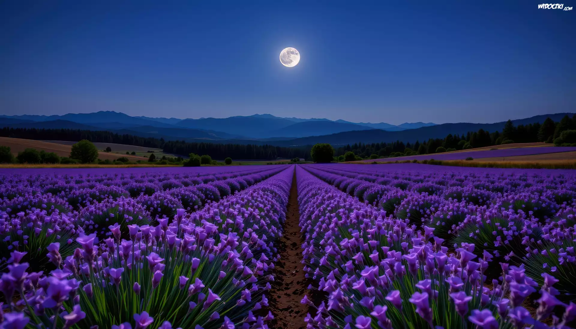 Pole, Fioletowe, Kwiaty, Góry, Księżyc, Noc, Grafika AI