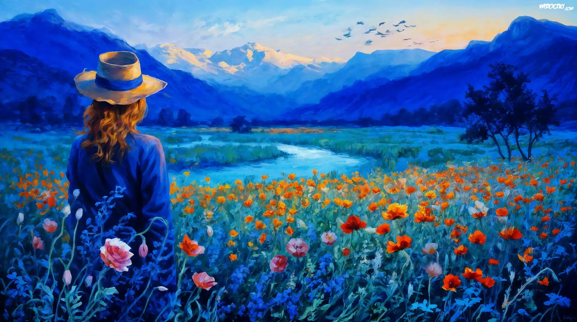Kobieta, Kapelusz, Kwiaty, Łąka, Rzeka, Góry, Grafika AI
