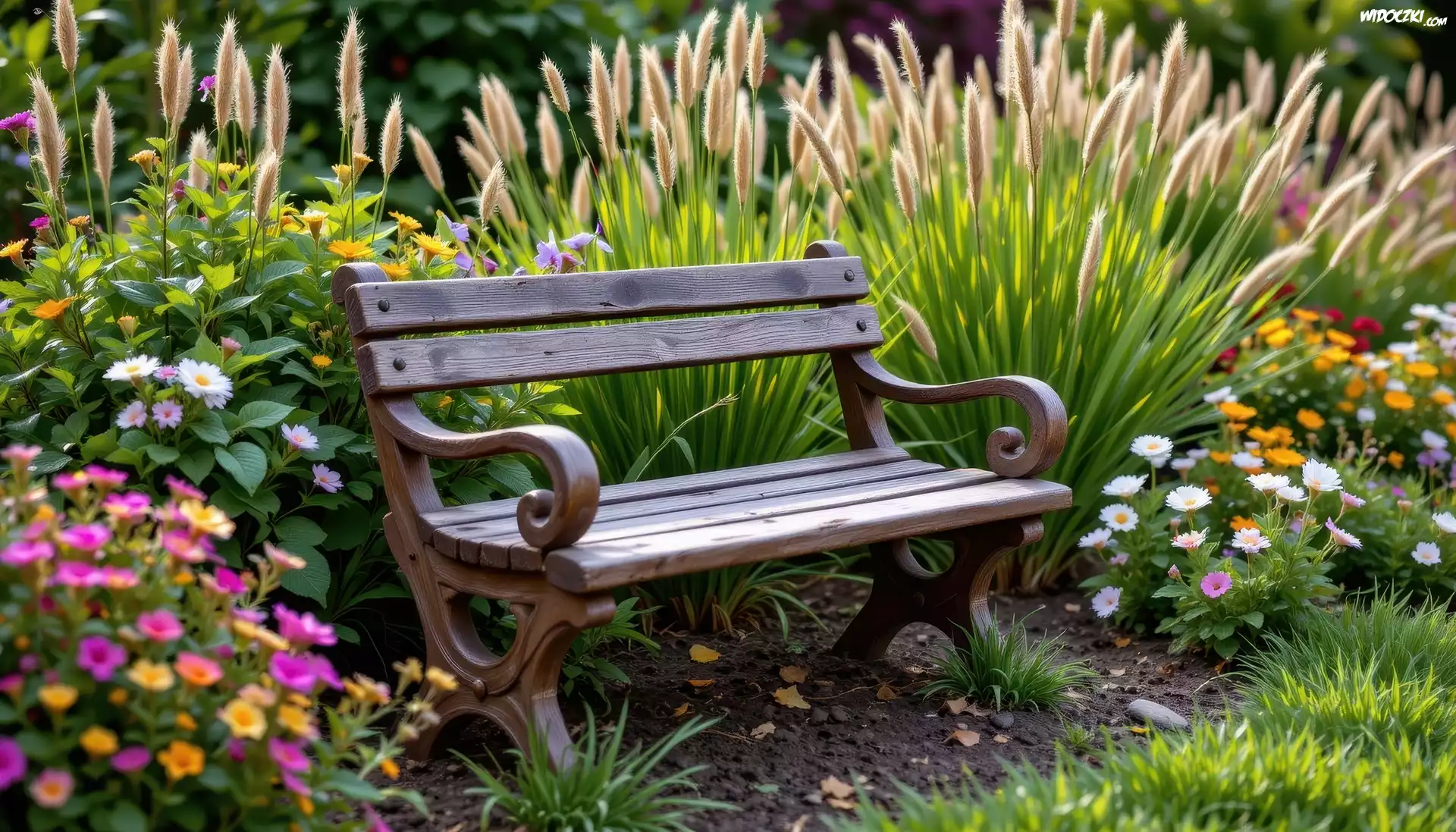 Ogród, Ławka, Kwitnące, Kwiaty, Wysokie, Trawy, Grafika AI
