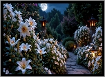 Kwiaty, Białe, Lilie, Latarnie. Ścieżka, Księżyc, Ogród, AI