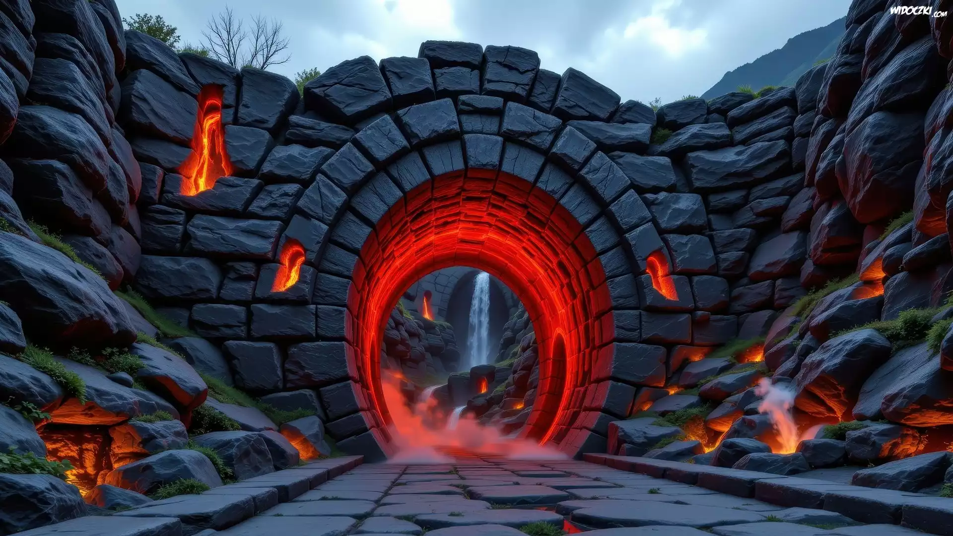 Skały, Mur, Łuk, Widok, Wodospad, Żarzące, Ognie, AI