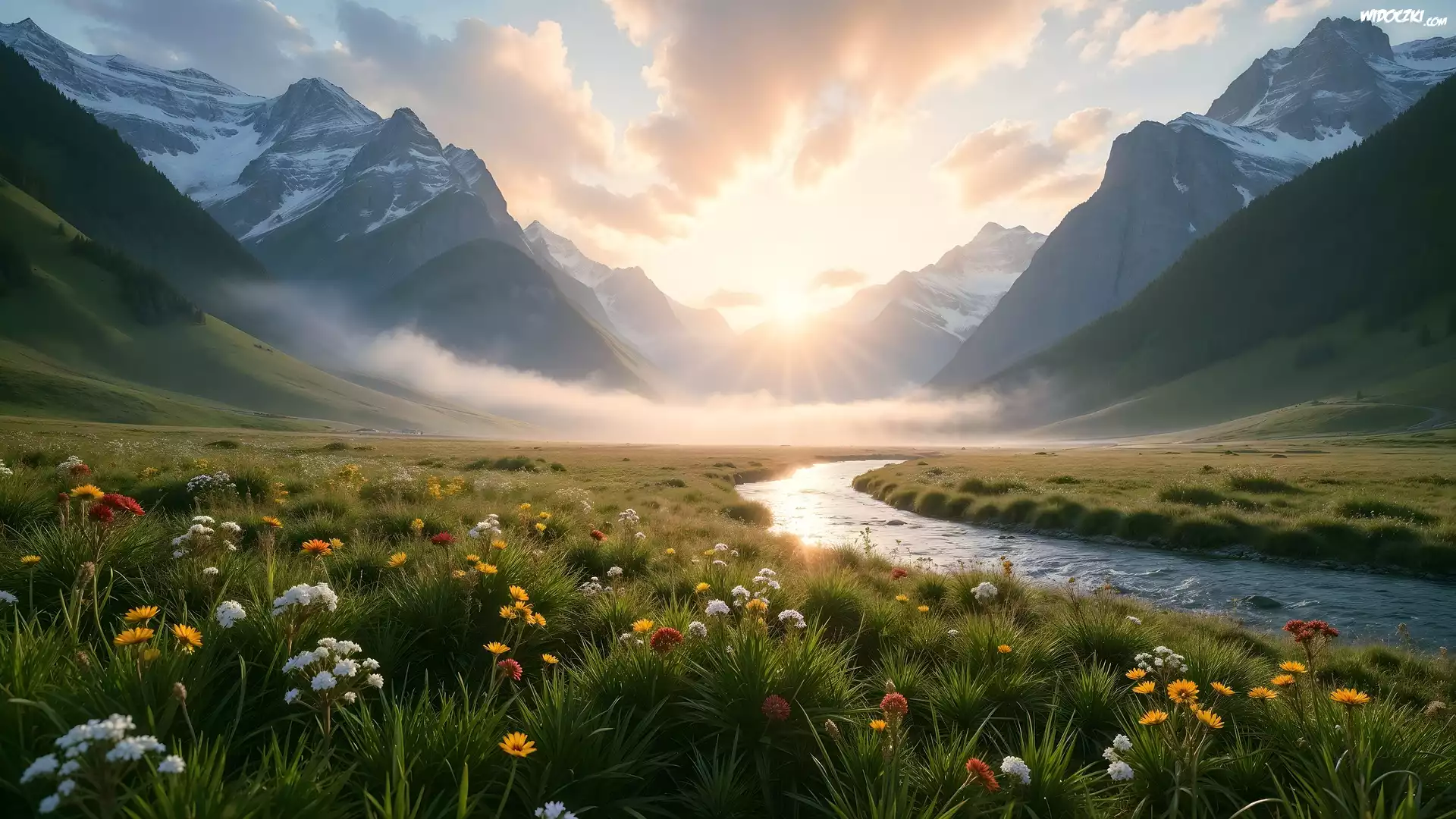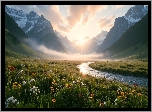 Góry, Rzeka, Mgła, Słoneczny blask, Łąka, Kwiaty, AI