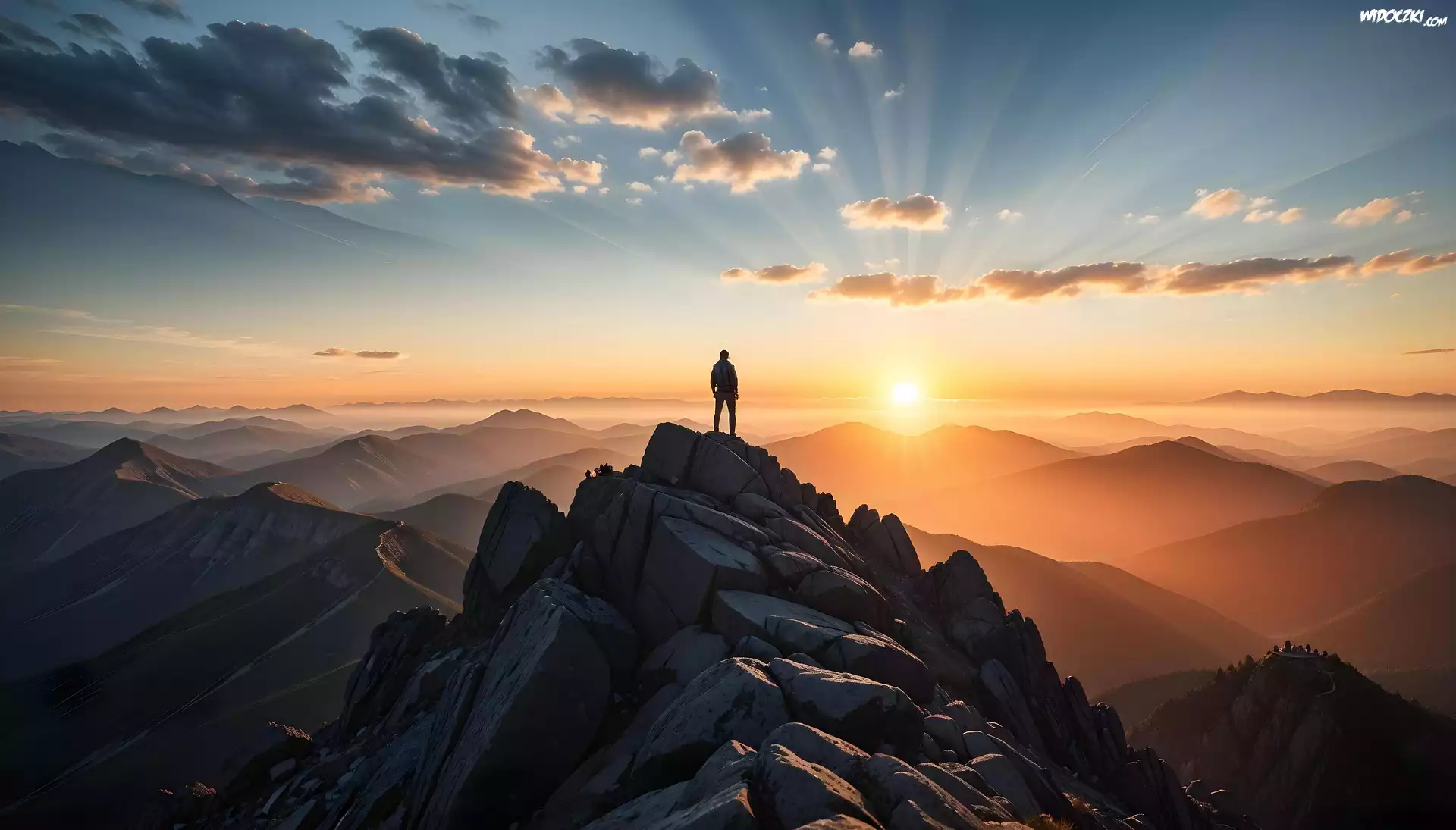Góry, Szczyty, Niebo, Zachód słońca, Człowiek, Grafika AI