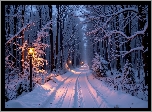 Zima, Las, Ośnieżone, Drzewa, Zaśnieżona, Droga, Latarnie, AI