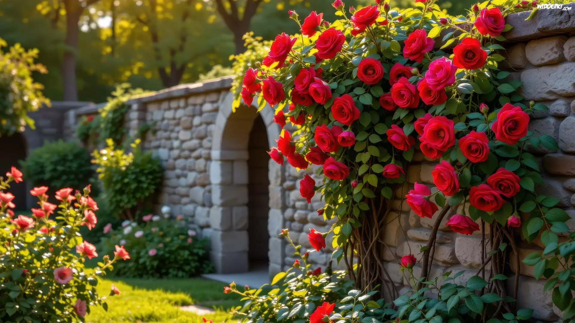 Kwiaty, Czerwone, Pnące, Róże, Mur, Krzewy, Ogród, AI