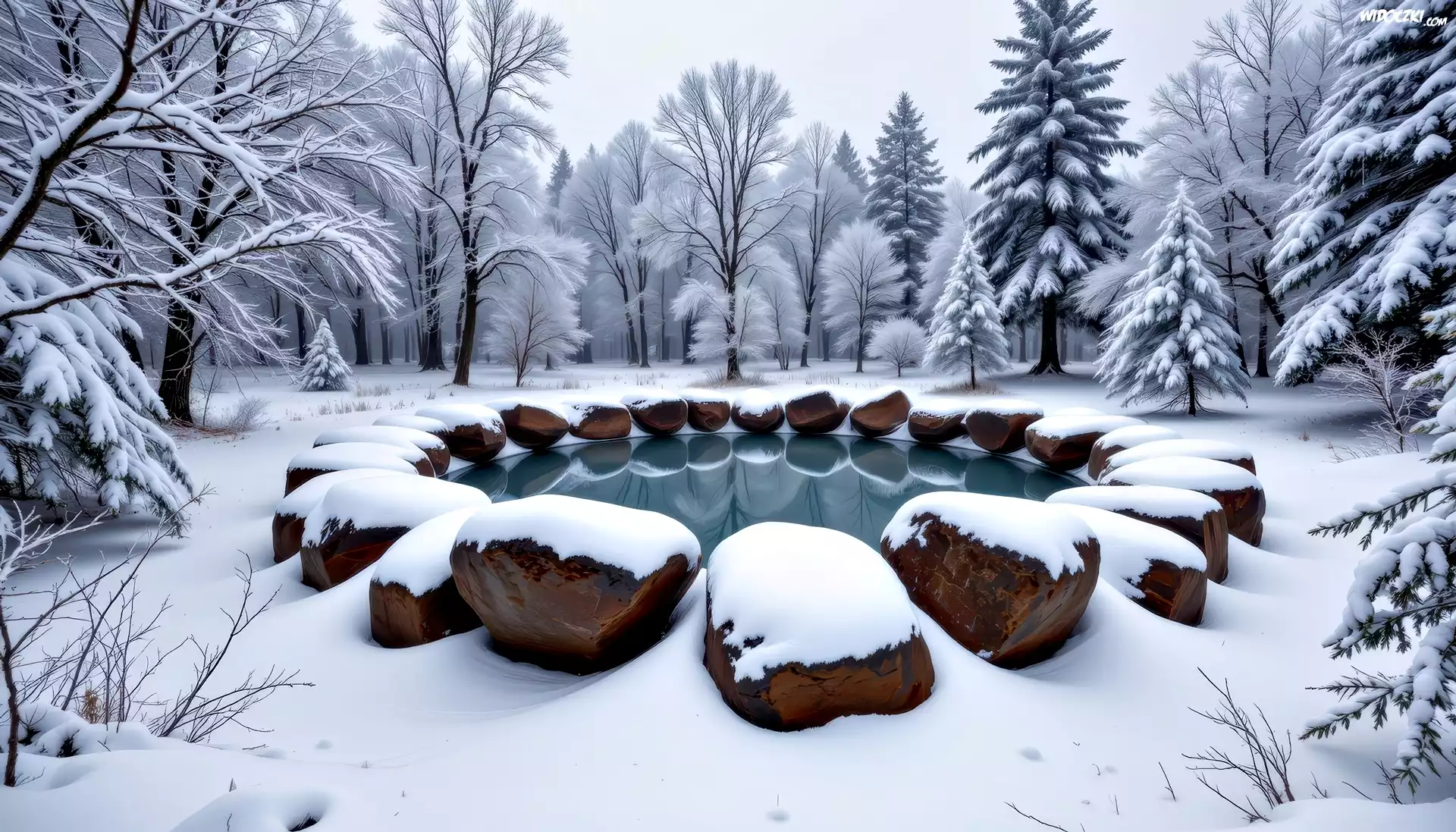 Zima, Drzewa, Polana, Woda, Kamienie, Las, Grafika AI
