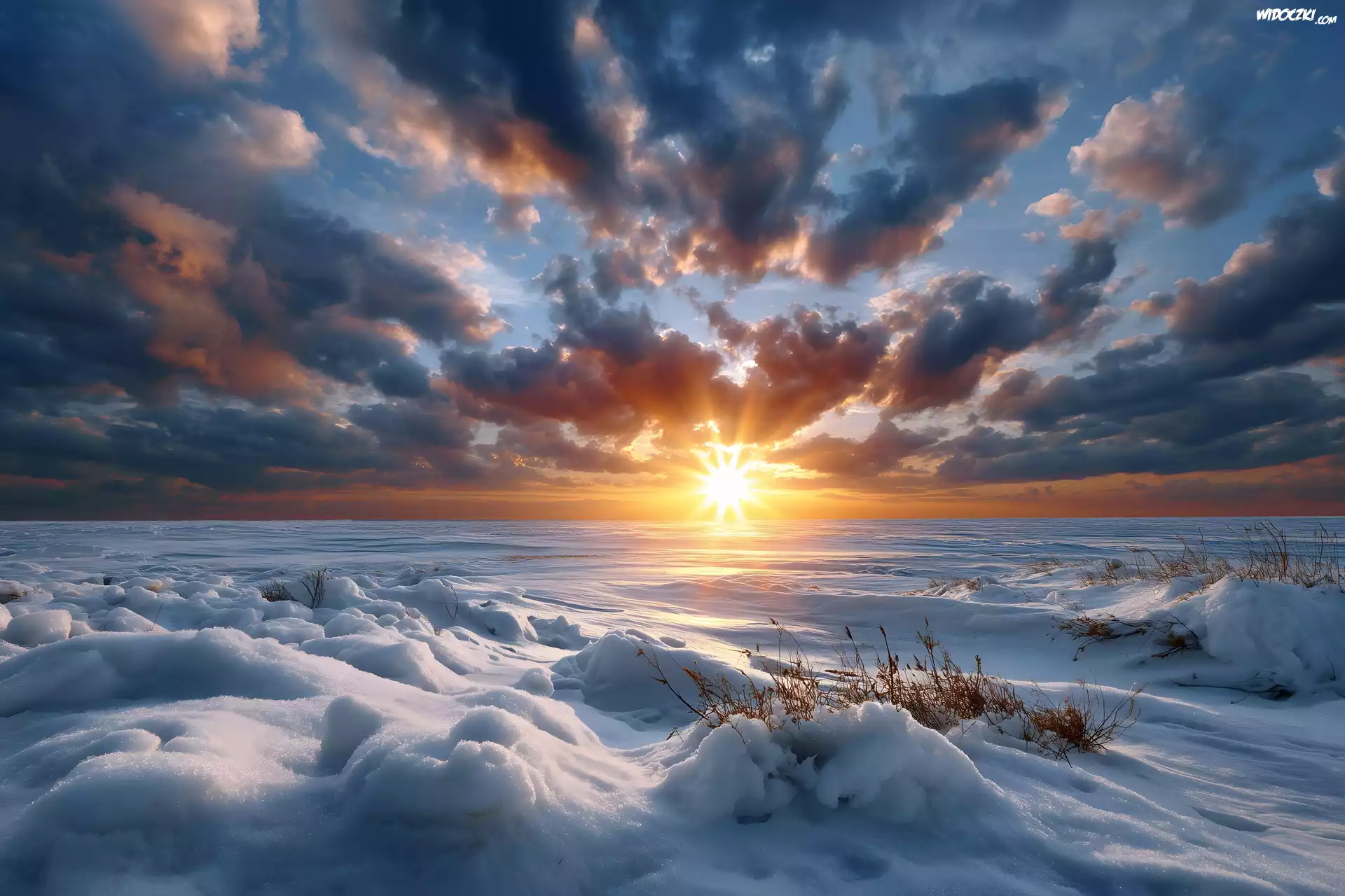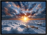 Zdjęcia, Zima, Ośnieżone, Pole, Chmury, Zachód słońca, Grafika AI