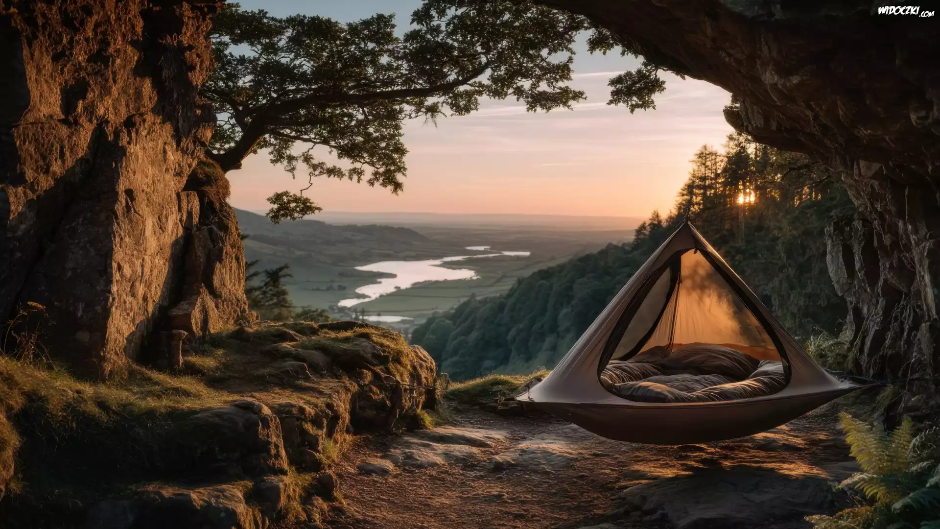 Wschód słońca, Skały, Drzewa, Hamak, Rzeka, Grafika AI