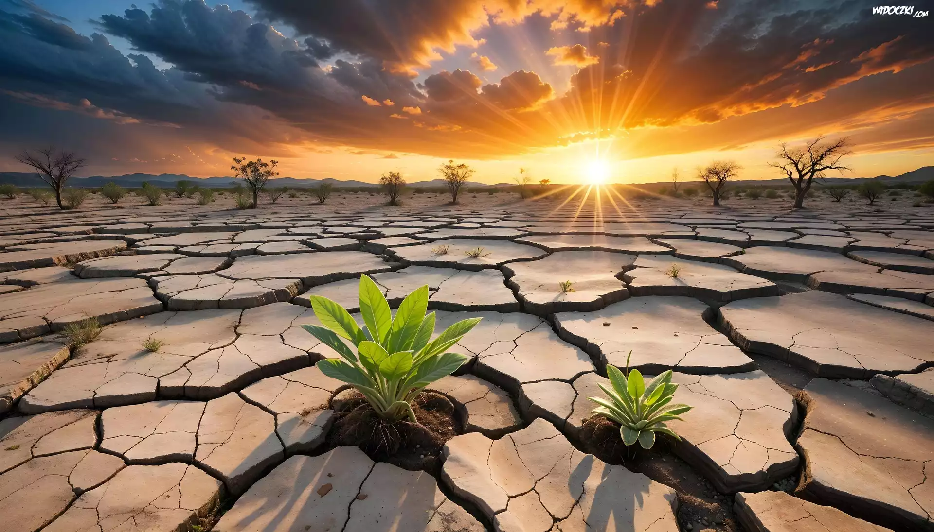Zdjęcia, Pustynia, Spękana, Ziemia, Rośliny, Promienie słońca, Grafika AI