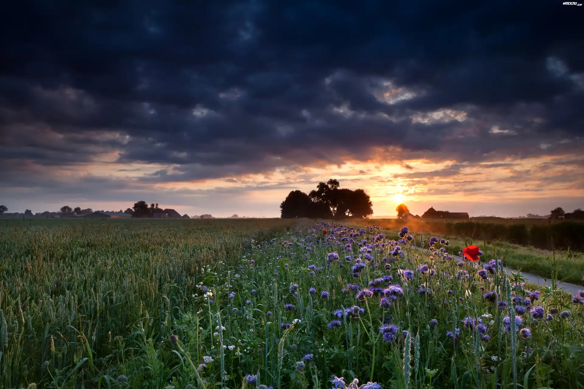 Łąka, Zachód słońca, Kwiaty, Drzewa, Chmury