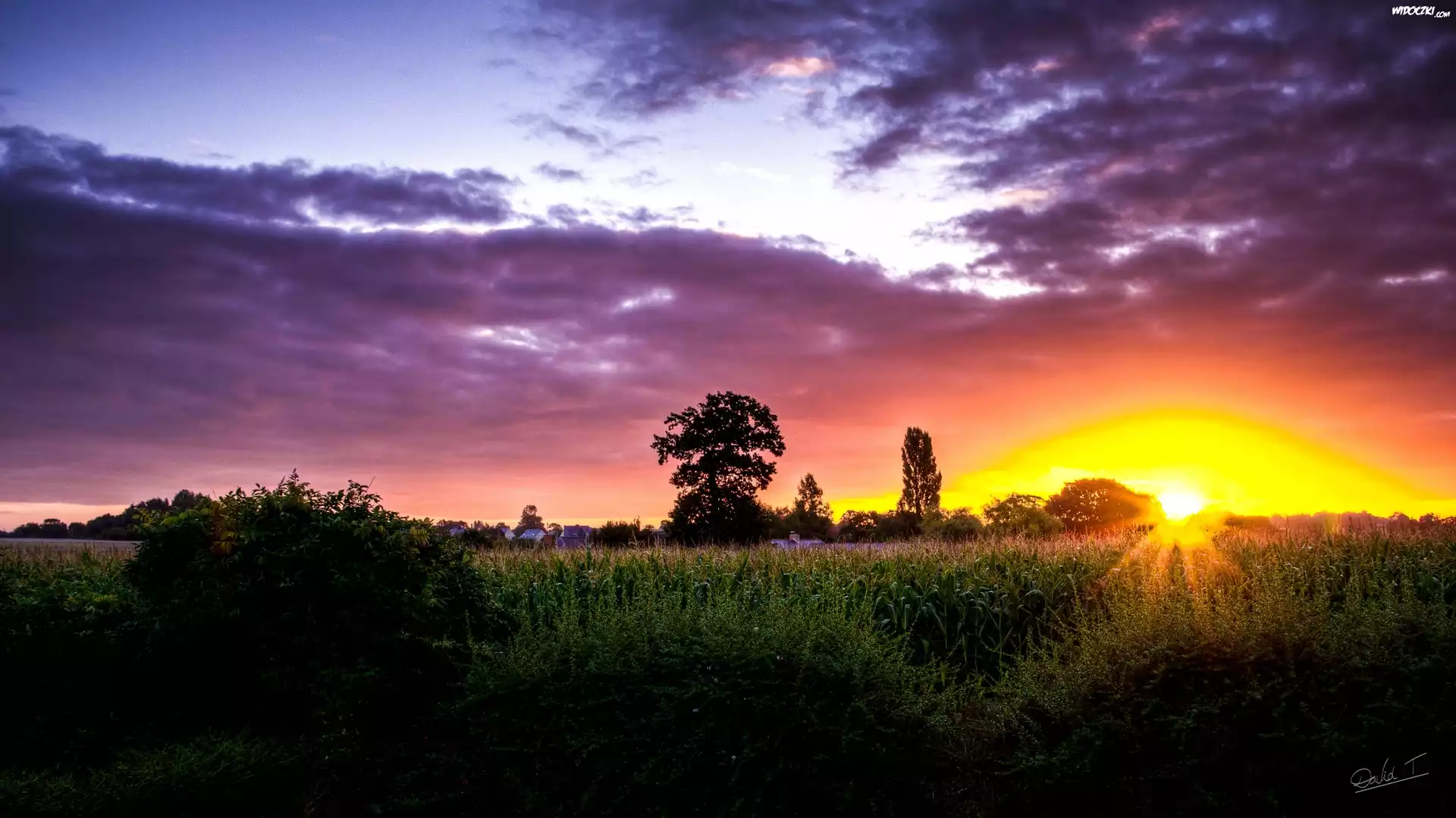 Zdjęcia, Łąka, Zachód słońca, Chmury, Niebo, Drzewa