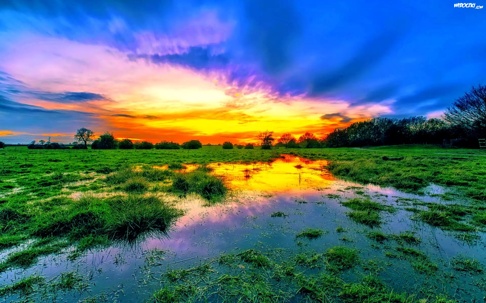 Zdjęcia, Łąka, Bagno, Chmury, Zachód Słońca, Drzewa