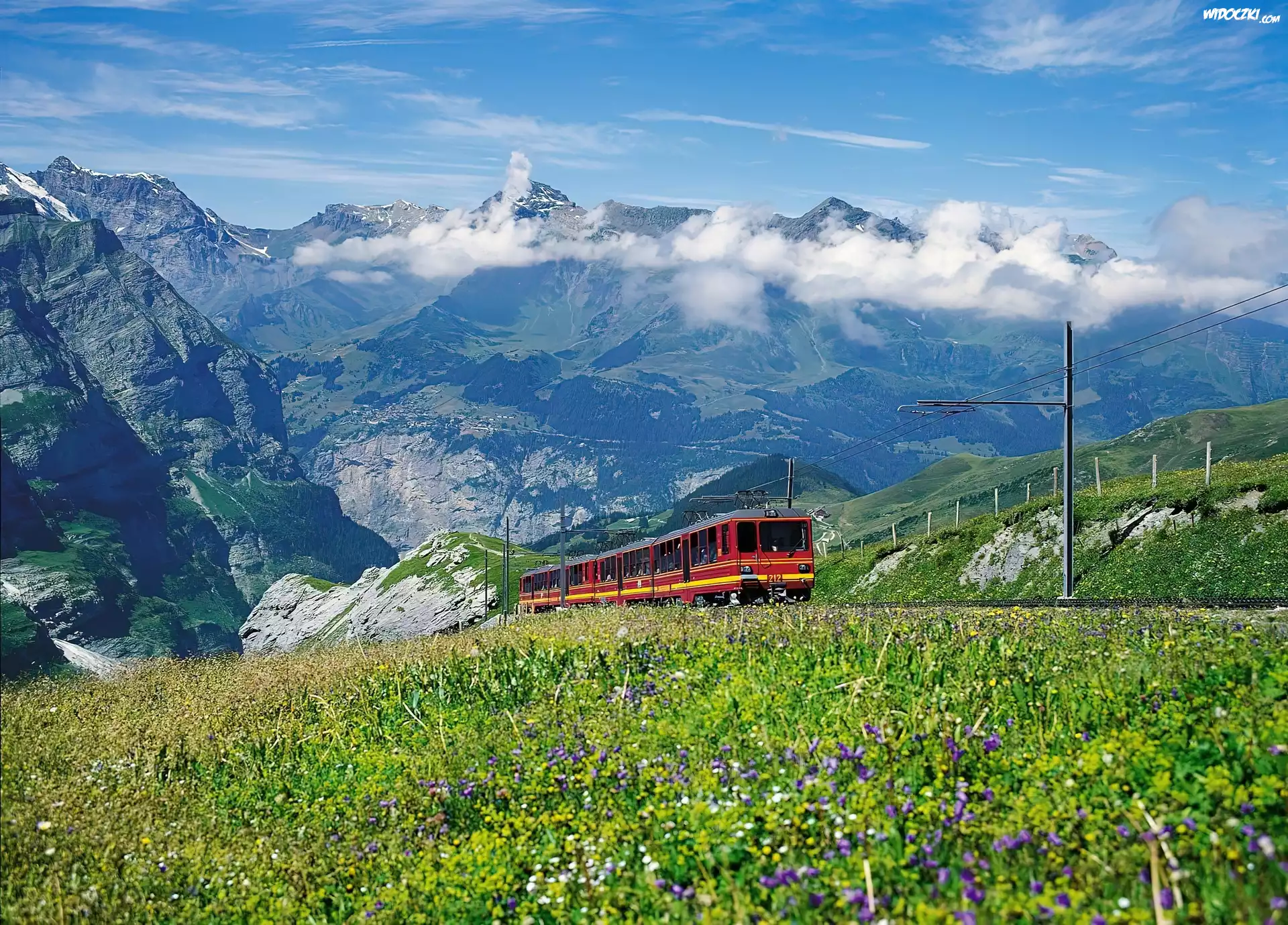 Zdjęcia, Łąka, Kwiaty, Góry, Chmury, Pociąg, Indie