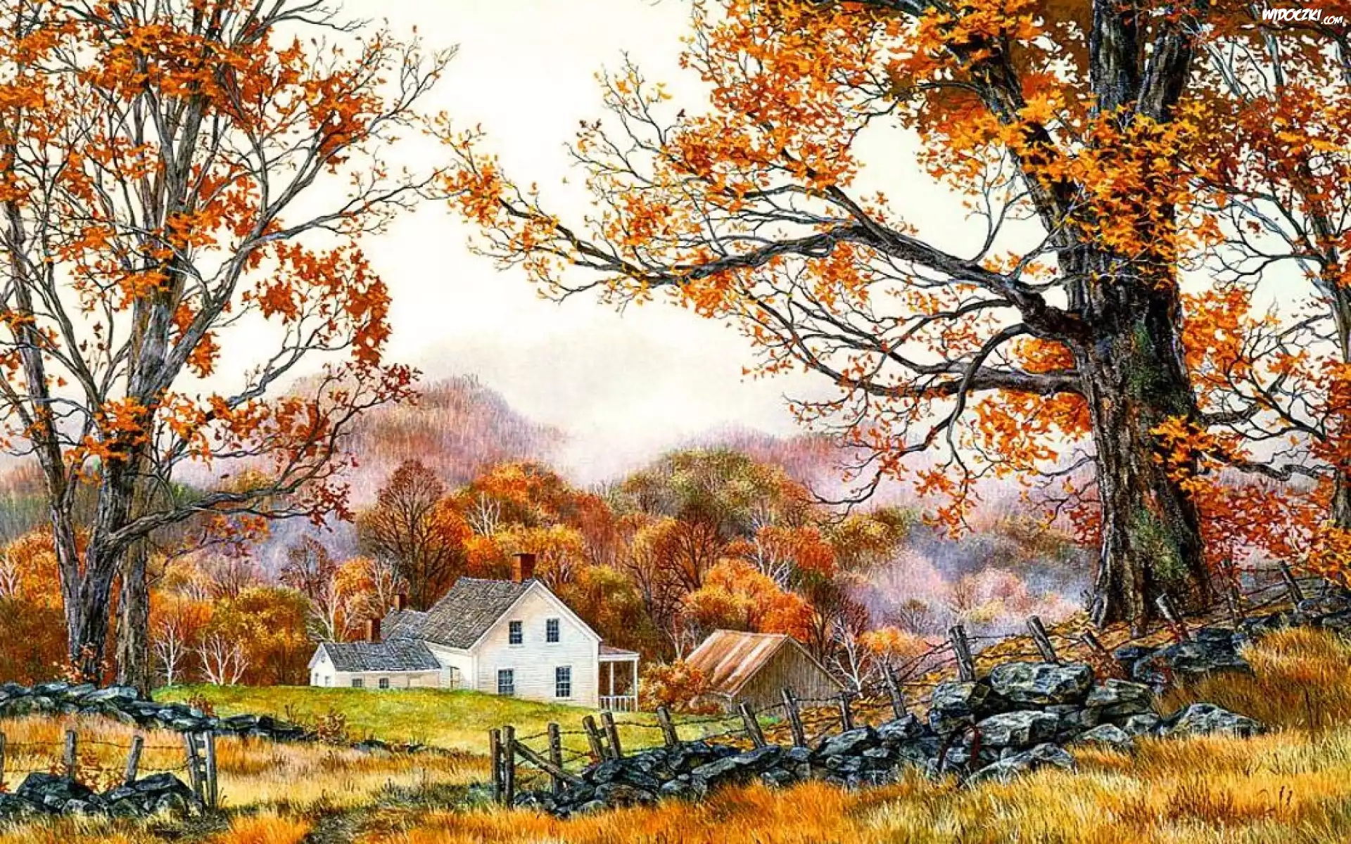Zdjęcia, Łąka, Dom, Murek, Płot, Drzewa, Jesień