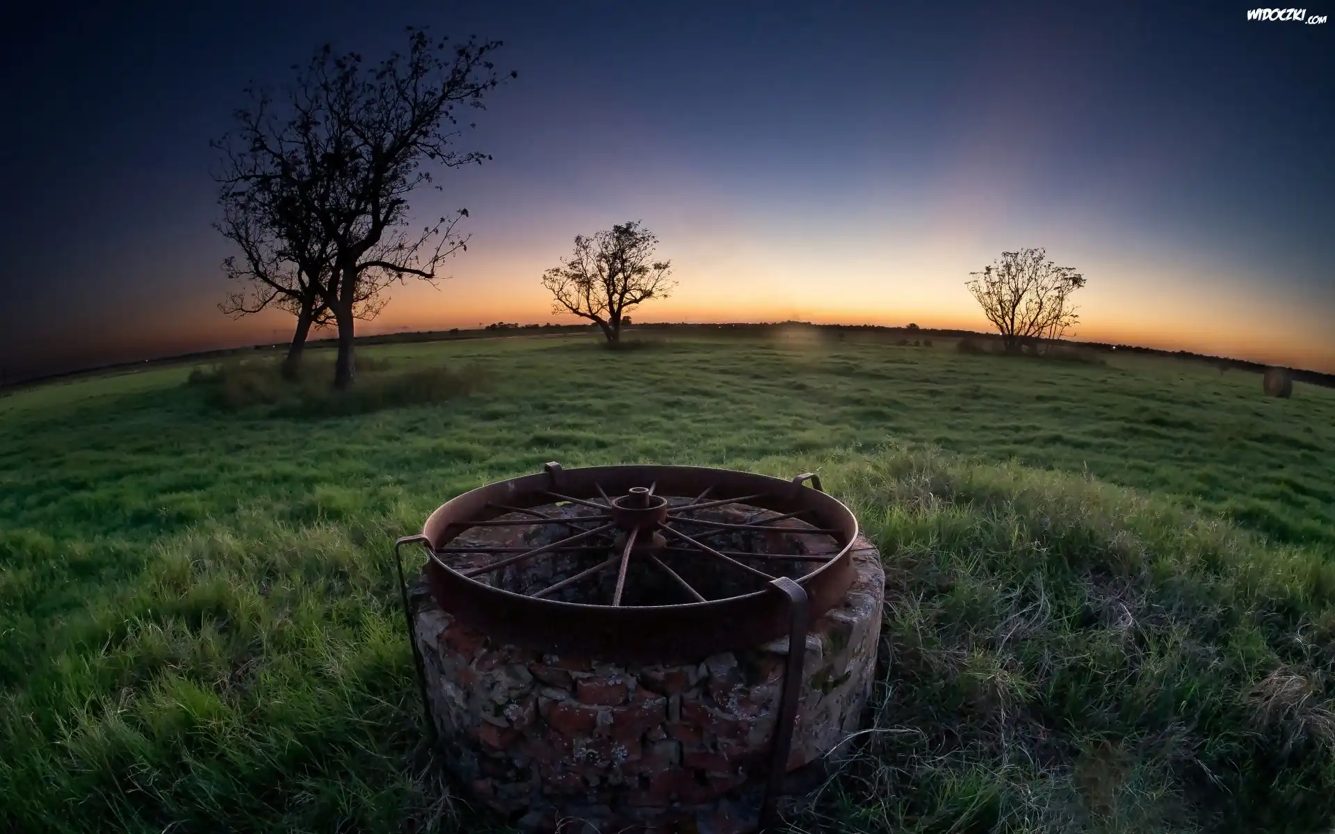 Zdjęcia, Łąka, Zachód Słońca, Drzewa, Studnia, Koło