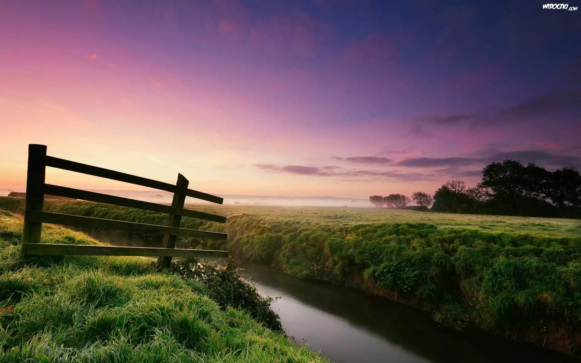 Zdjęcia, Łąka, Trawa, Rzeka, Płot, Drzewa, Niebo