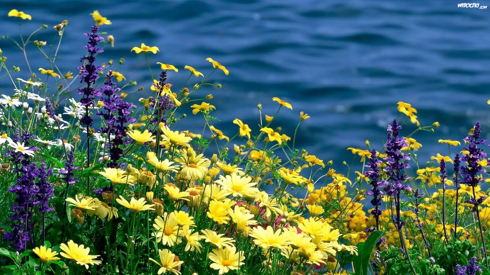 Żółte, Kwiaty, Polne Zachmurzone, Niebo, Morski, Brzeg, Łąka Wiosna, Lato, Łąka Noc, Światła, Diabelski, Młyn, Rzeka Mlecze, Łąka, Promienie, Słoneczne, Niebo Góra, Rzeki Jezioro, Drzewa, Domki, Chmury Łąka, Woda, Niebo Wiosna, Góry, Łąka Łąka, Domek, Budowa Zając, Trawa, Łąka Zachód Słońca, Pień Rower, Pole Łąka, Piknik