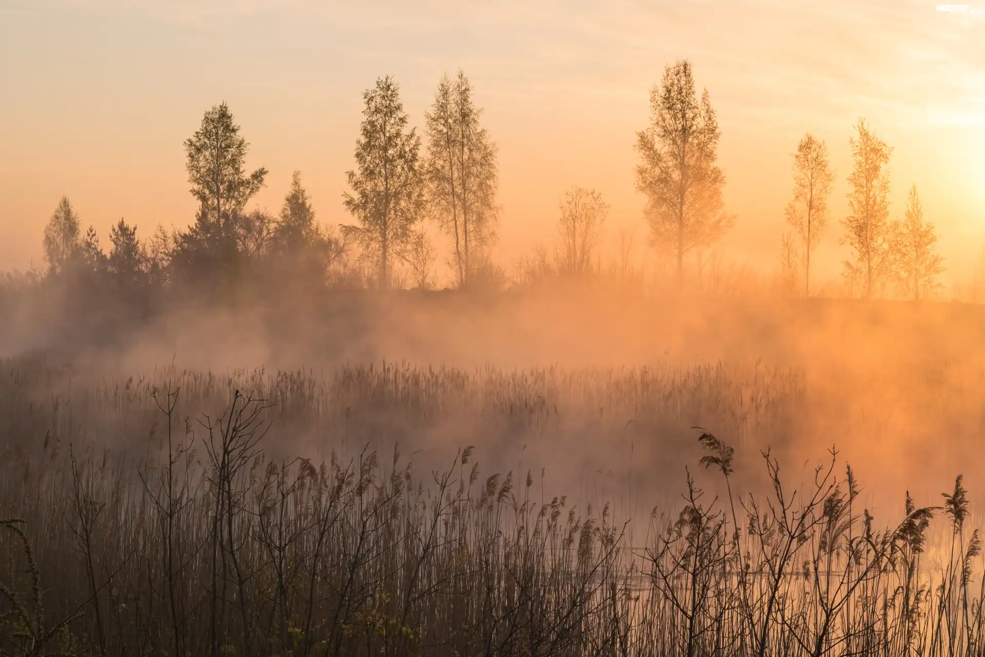 Łąka, Mgła, Trawa, Drzewa, Wschód słońca