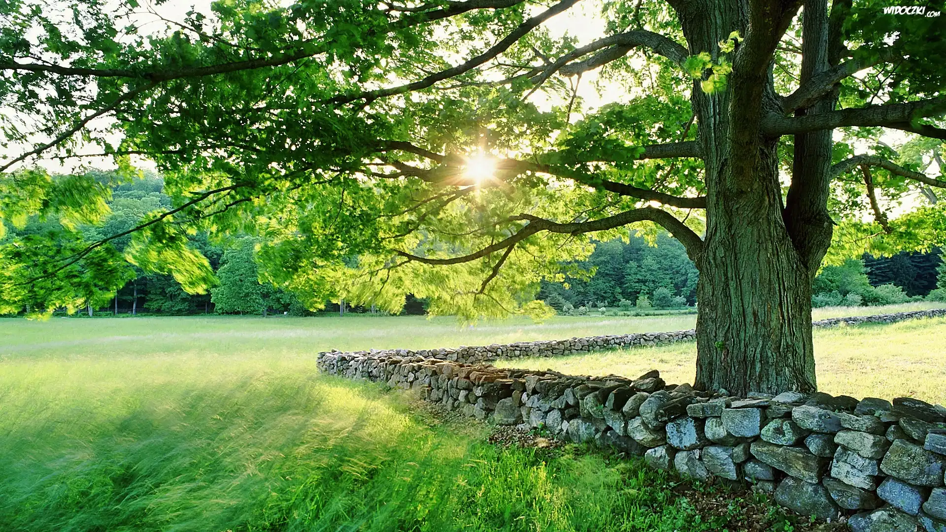 Zdjęcia, Łąka, Las, Drzewo, Kamienie, Promienie, Słońca