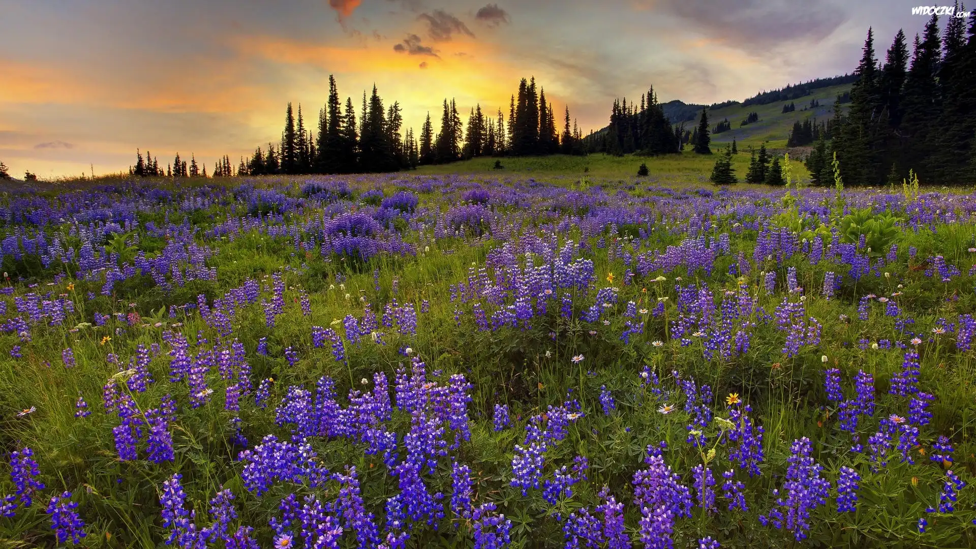 Łąka, Promienie, Zachodzącego, Słońca, Drzewa, Łubin